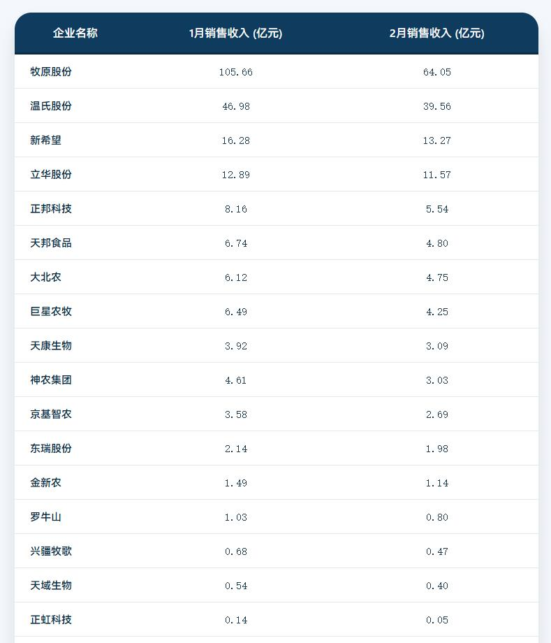 收入数据最能说明问题。牧原股份从1月的105.66亿元降到2月的64.05亿元,降幅近40%。温氏股份也从46.98亿元降到39.56亿元。几乎清一色都是环比下降,与销量下降、价格下降的双重挤压直接相关。