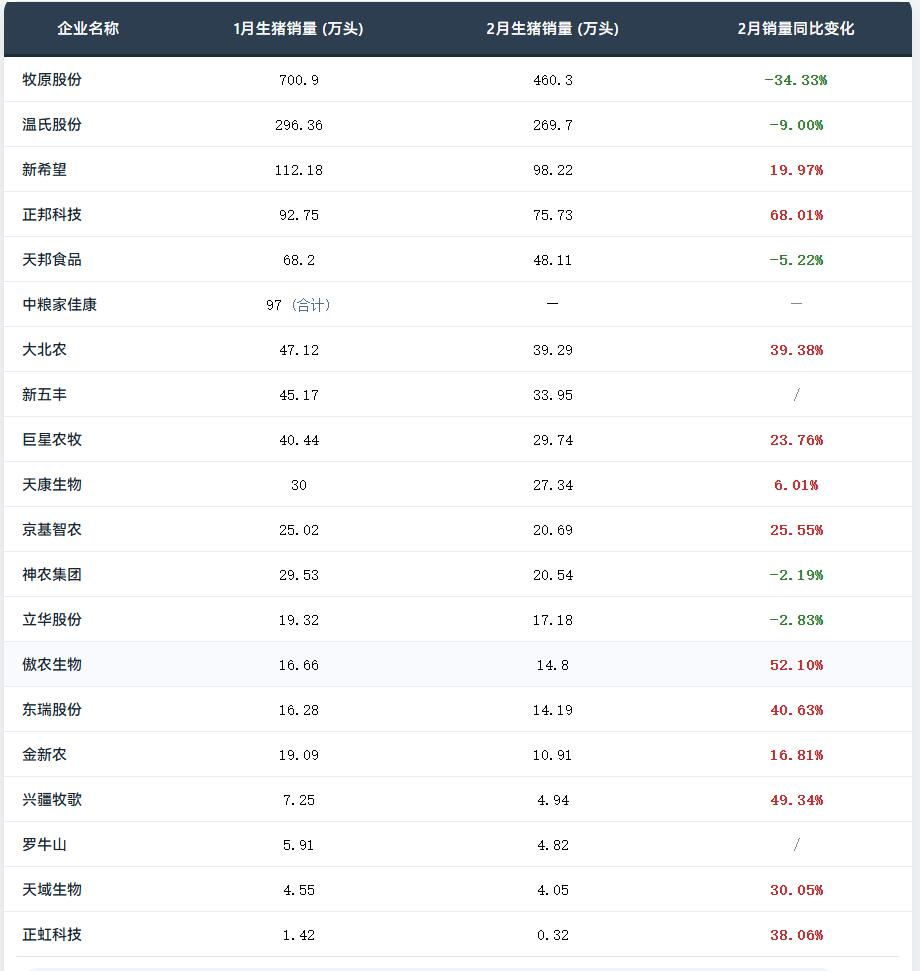 天邦食品、大北农、新五丰、巨星农牧这几家,月出栏量基本在30-70万头之间,属于中型规模企业的代表。其中巨星农牧表现抢眼,1月出栏40.44万头,2月29.74万头,同比增幅23.76%。从产能释放节奏看,这家企业的猪场管理和代养模式似乎跟得上扩张步伐。