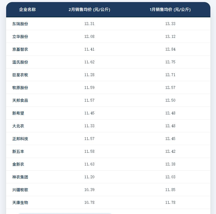 从1月到2月,所有企业的销售均价都在往下走,每公斤降了1块钱左右。春节后本来就是传统消费淡季,叠加去年能繁母猪存栏量逐步恢复,市场供应充足,猪价承压在预料之中。