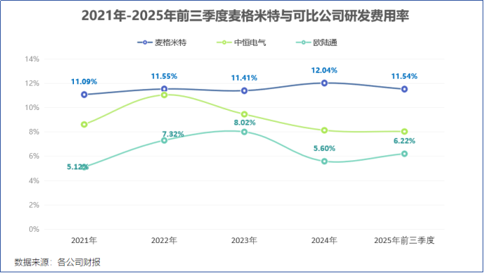 再加上,麦格米特研发投入力度长期高于中恒电气、欧陆通等同业公司,2025年前三季度公司研发费用率为11.54%,近年来基本维持在11%以上。