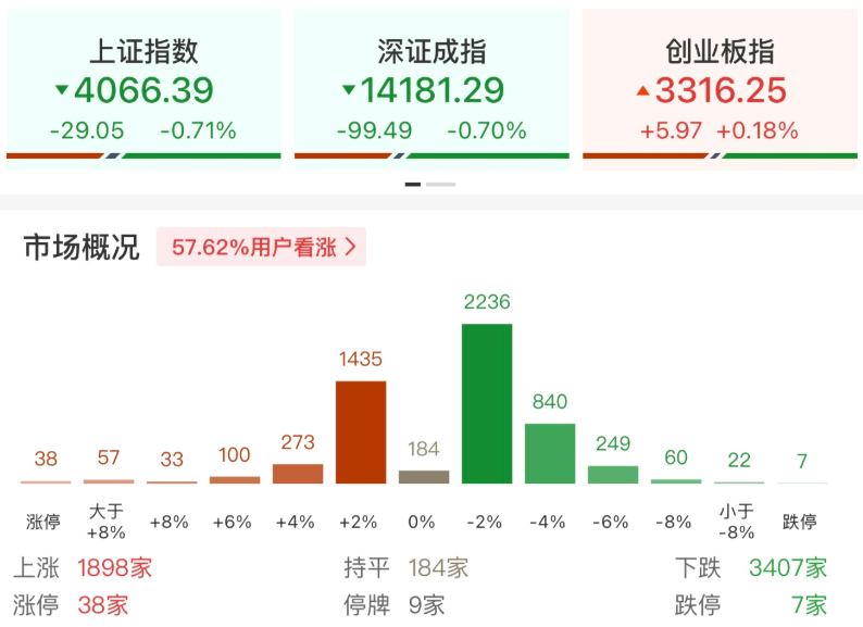 今日早盘,A股三大指数涨跌不一,沪指、深成指早盘震荡调整,盘中均跌超1%。沪深两市半日成交额1.51万亿,较上个交易日放量20亿。盘面上热点弱势轮动,全市场超3400只个股下跌。截至收盘,沪指跌0.71%,深成指跌0.7%,创业板指涨0.18%。