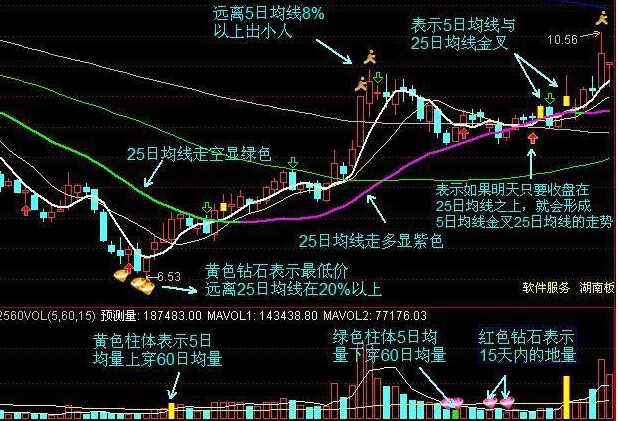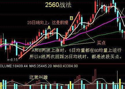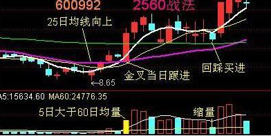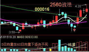 他用的是摆脱厄运远离亏损的2560战法,在他的专著里透露这个方法其实非常简单——25日均线坚决向上,5日均线上穿或回踩25日均线时,成交量5均量大于60均量就是介入机会,最好此时出现缩量小星线过渡: