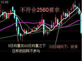 《2560战法》有2个最基本的条件:一是25日均线必须是向上,起码也是走平;二是5日均量线必须在60日均量线之上,也就是在均量金叉当日或之后入场才符合要求。