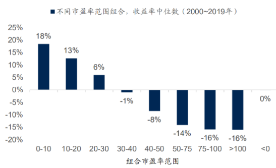 市盈率0到10倍的为一组,10到20倍的为一组,20到30倍的为一组,30到40倍的为一组,40到50倍的为一组,50到75倍的为一组,1000倍以上的为一组,市盈率为负(亏损)的单独为一组。然后计算t+1年该组合中股票的年收益率,每年滚动换一次样本,时间范围是2000年至2019年。