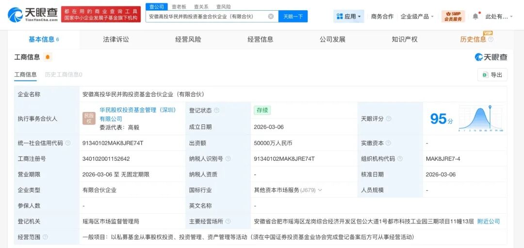 近日,安徽高投华民并购投资基金合伙企业(有限合伙)成立,执行事务合伙人为华民股权投资基金管理(深圳)有限公司,出资额5亿人民币,经营范围为以私募基金从事股权投资、投资管理、资产管理等活动。合伙人信息显示,该基金由合肥市瑶海区科技创新投资基金合伙企业(有限合伙)连云港高新股权投资合伙企业(有限合伙)、连云港润海股权投资基金合伙企业(有限合伙)、安徽省三重一创产业发展二期基金有限公司等共同出资。