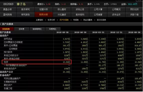 第二种是存货减值,比如去年推到风口浪尖的獐子岛,公告称扇贝饿死了,有可能出现存货减值,我们看一下獐子岛的数据,存货10.84亿,总负债才34.07亿,占比32%,营业收入也才20.11亿,占比都非常高!如果这些存货全部减值,那简直就是毁灭性的打击!所以如果一家公司的存货特别大的,需要去了解这些存货是否有减值的风险了。