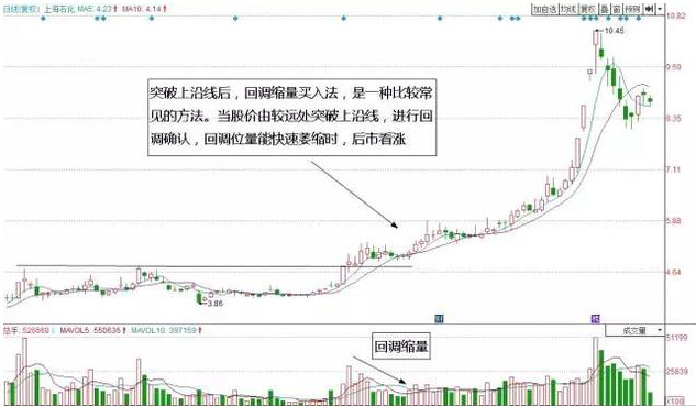 如图2-3所示,上海石化放量突破上沿线后,回调缩量,等5日均线金叉10均线时买入。