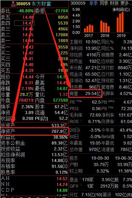 当然也不是所有商誉值很大的公司都会暴雷,需要我们去分析这公司的具体情况,比如东方财富商誉值29.54亿,净资产207.8亿,占比14%,接近20%,也是挺高的,但是我们细看这个29.54亿的商誉,原来是由于东财当年收购了同信证券产生的,很明显这个商誉是99.99%都不会有减值的,因为现在东财的发展已经非常好了,成为了中国最优秀的互联网券商,东财这个品牌可以说是家喻户晓了,所以这些商誉几乎是不会有减值的风险。