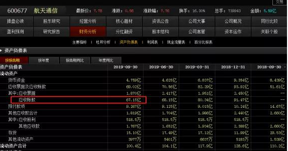 第三种是应收账款减值,也称为信用减值,比如之前暴雷的航天通信,三季报显示应收账款67.15亿,总资产是137.6亿,占比高达45%,说明接近有一半的资产都存在减值的风险!