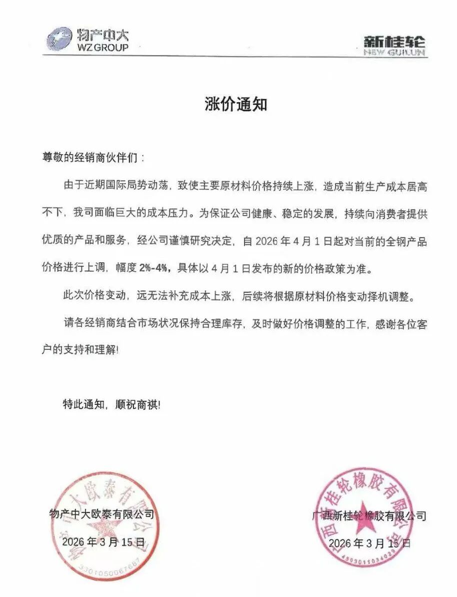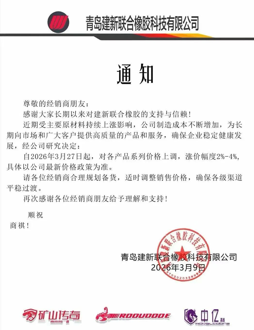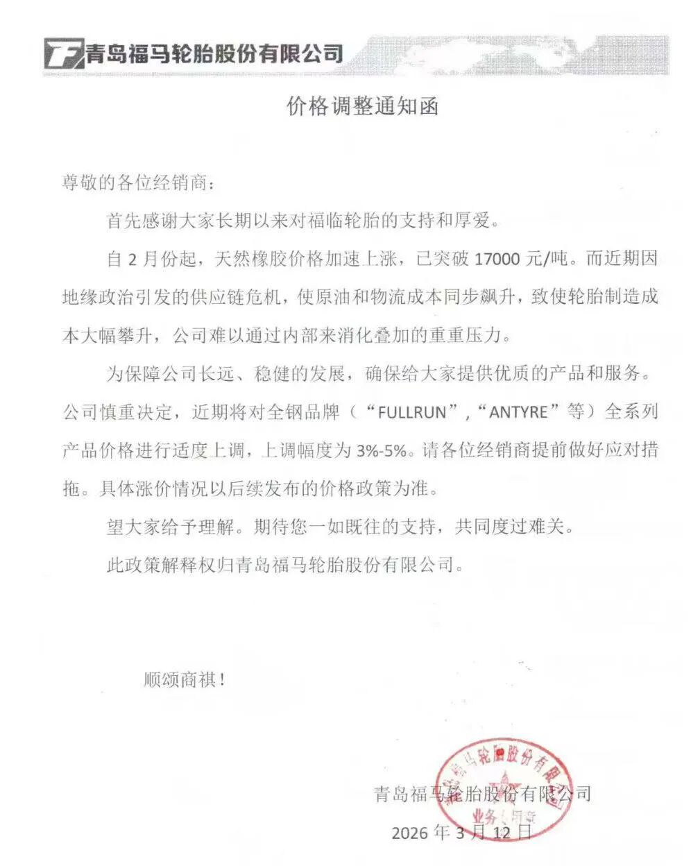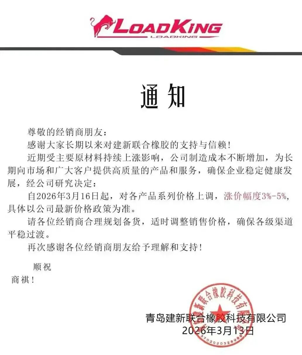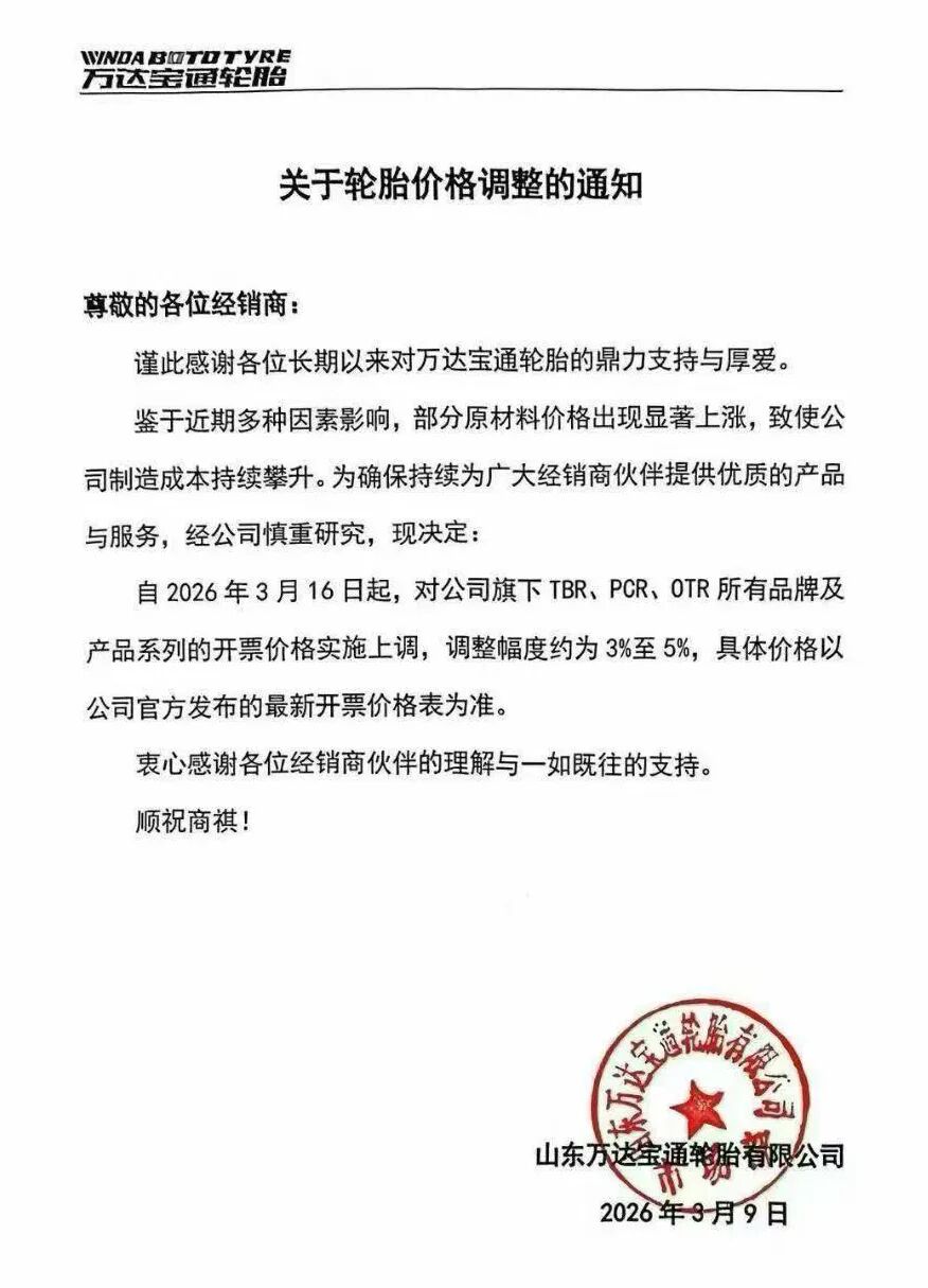 此次涨价潮来势汹汹,头部企业的动作尤为密集且具有风向标意义。3月13日,万力轮胎、雄鹰轮胎、浦林成山同日发布调价通知;3月15日,物产中大旗下欧泰、恒荣橡胶、新桂轮紧随其后,宣布涨价幅度在2%-4%之间。