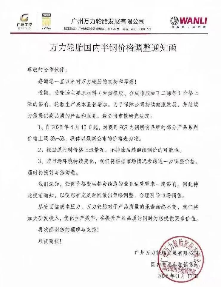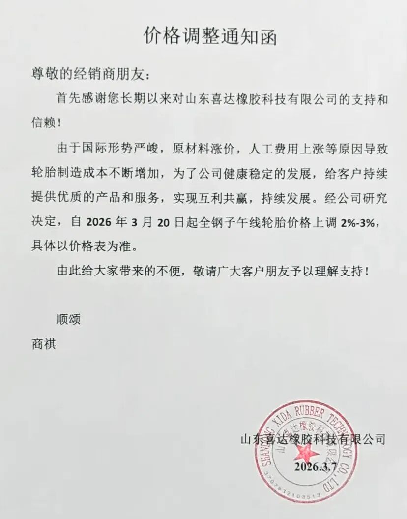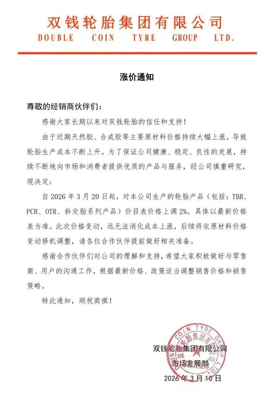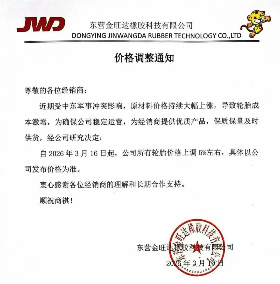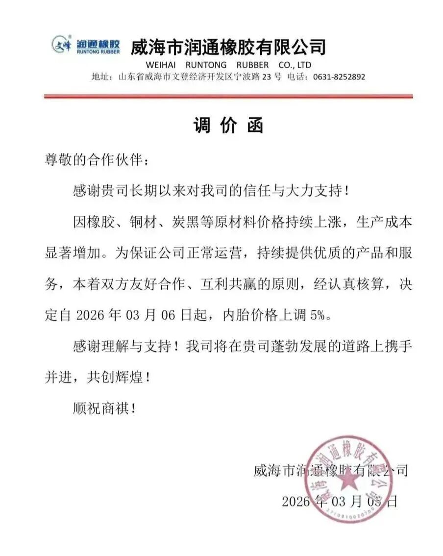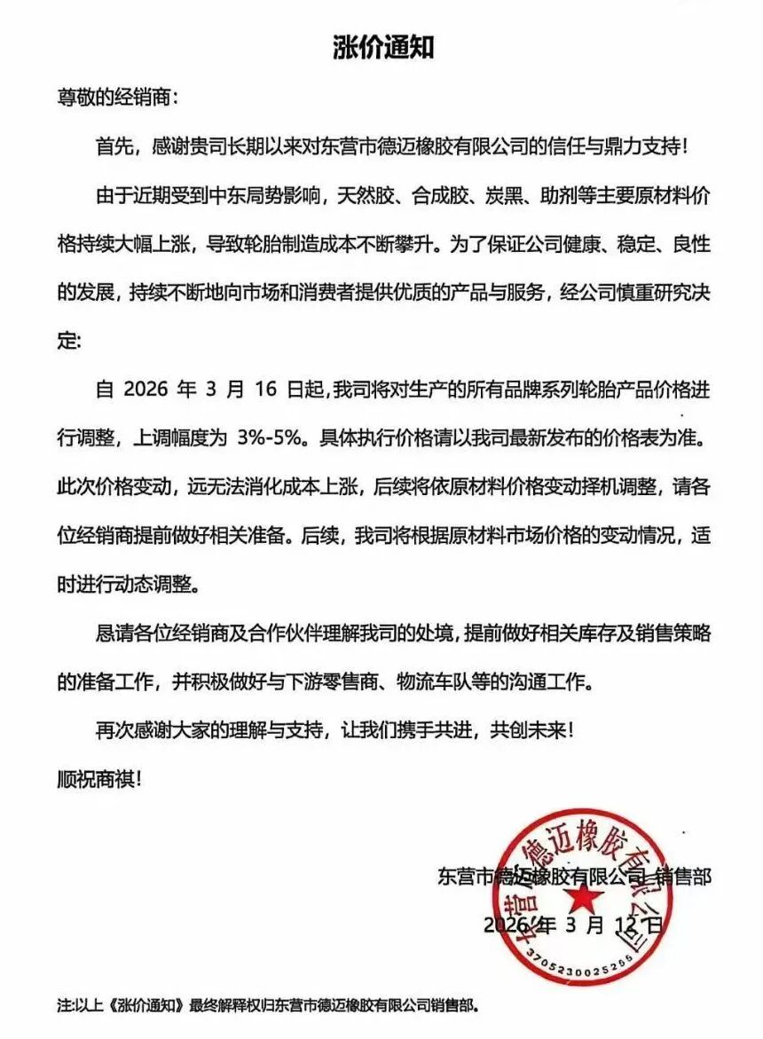 此次涨价潮来势汹汹,头部企业的动作尤为密集且具有风向标意义。3月13日,万力轮胎、雄鹰轮胎、浦林成山同日发布调价通知;3月15日,物产中大旗下欧泰、恒荣橡胶、新桂轮紧随其后,宣布涨价幅度在2%-4%之间。