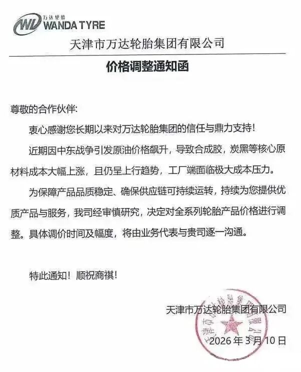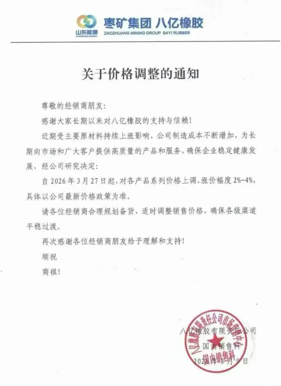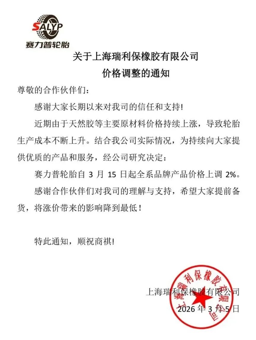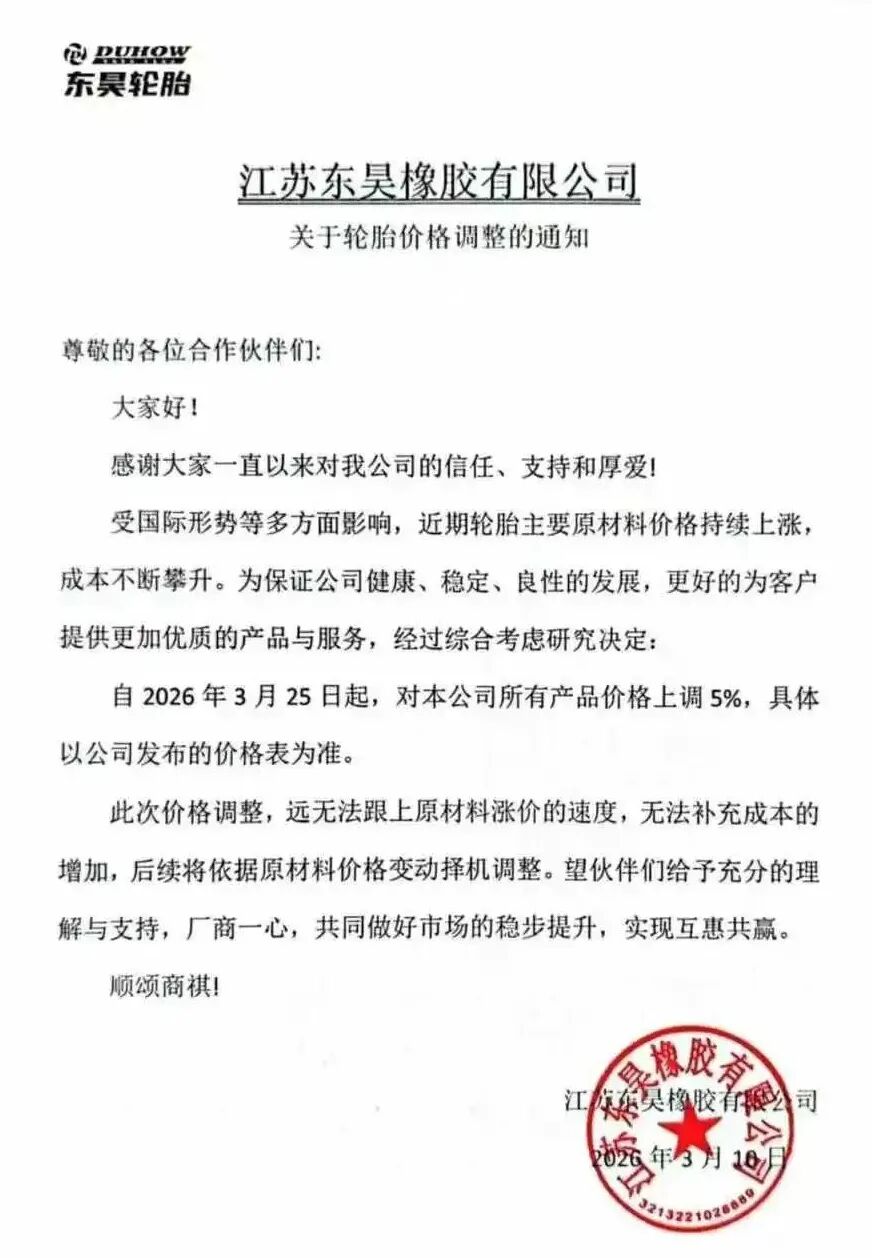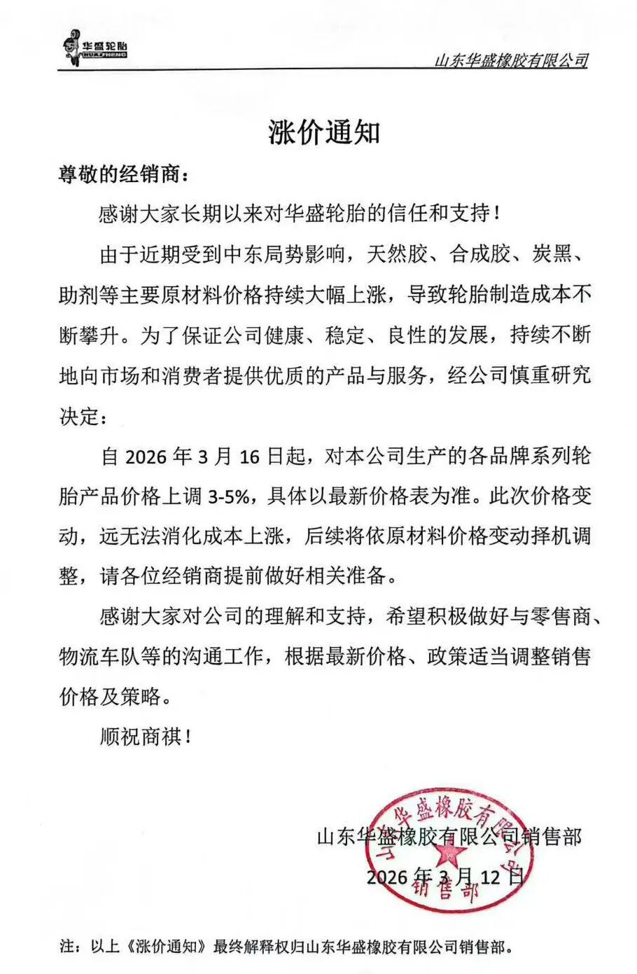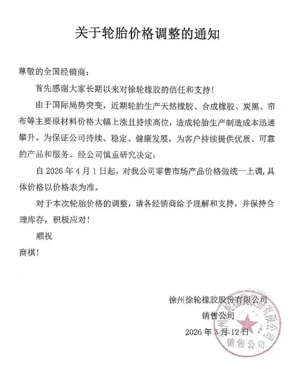 此次涨价潮来势汹汹,头部企业的动作尤为密集且具有风向标意义。3月13日,万力轮胎、雄鹰轮胎、浦林成山同日发布调价通知;3月15日,物产中大旗下欧泰、恒荣橡胶、新桂轮紧随其后,宣布涨价幅度在2%-4%之间。