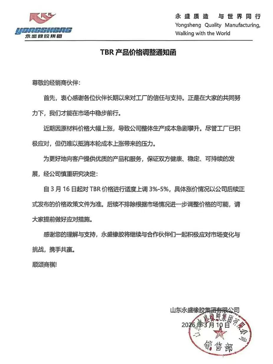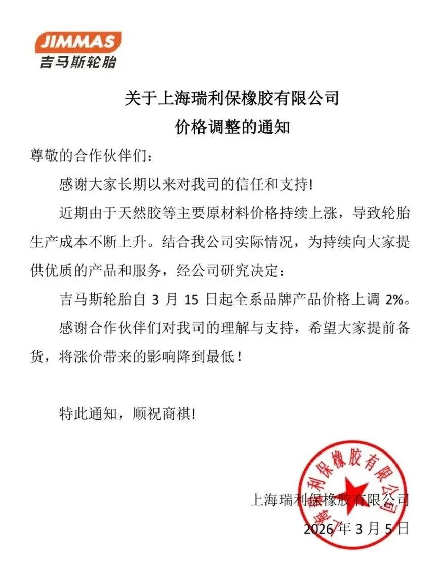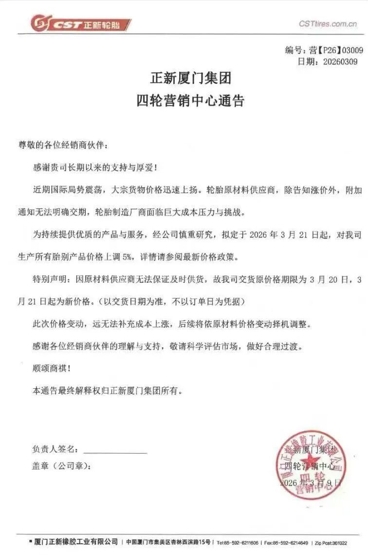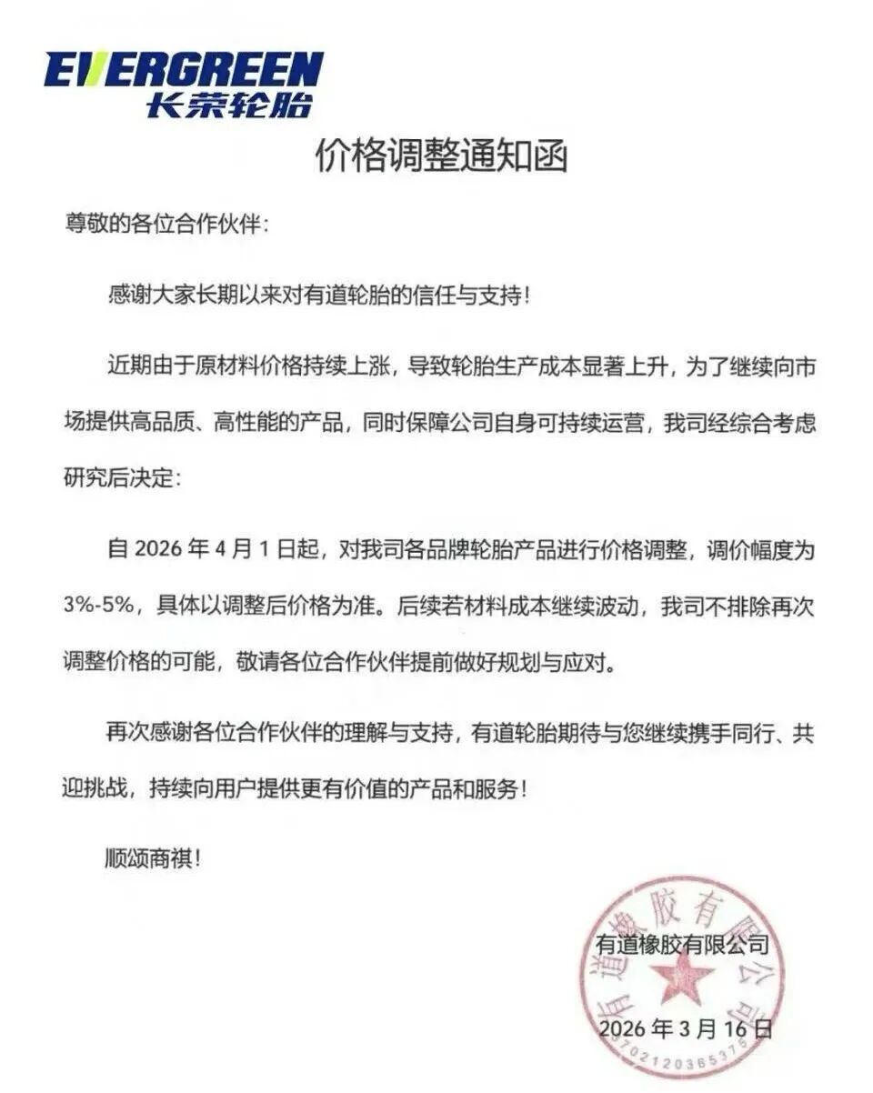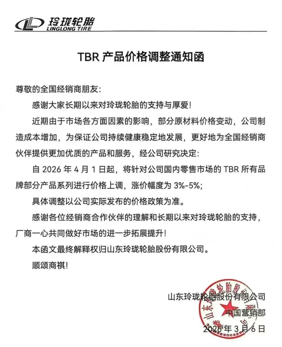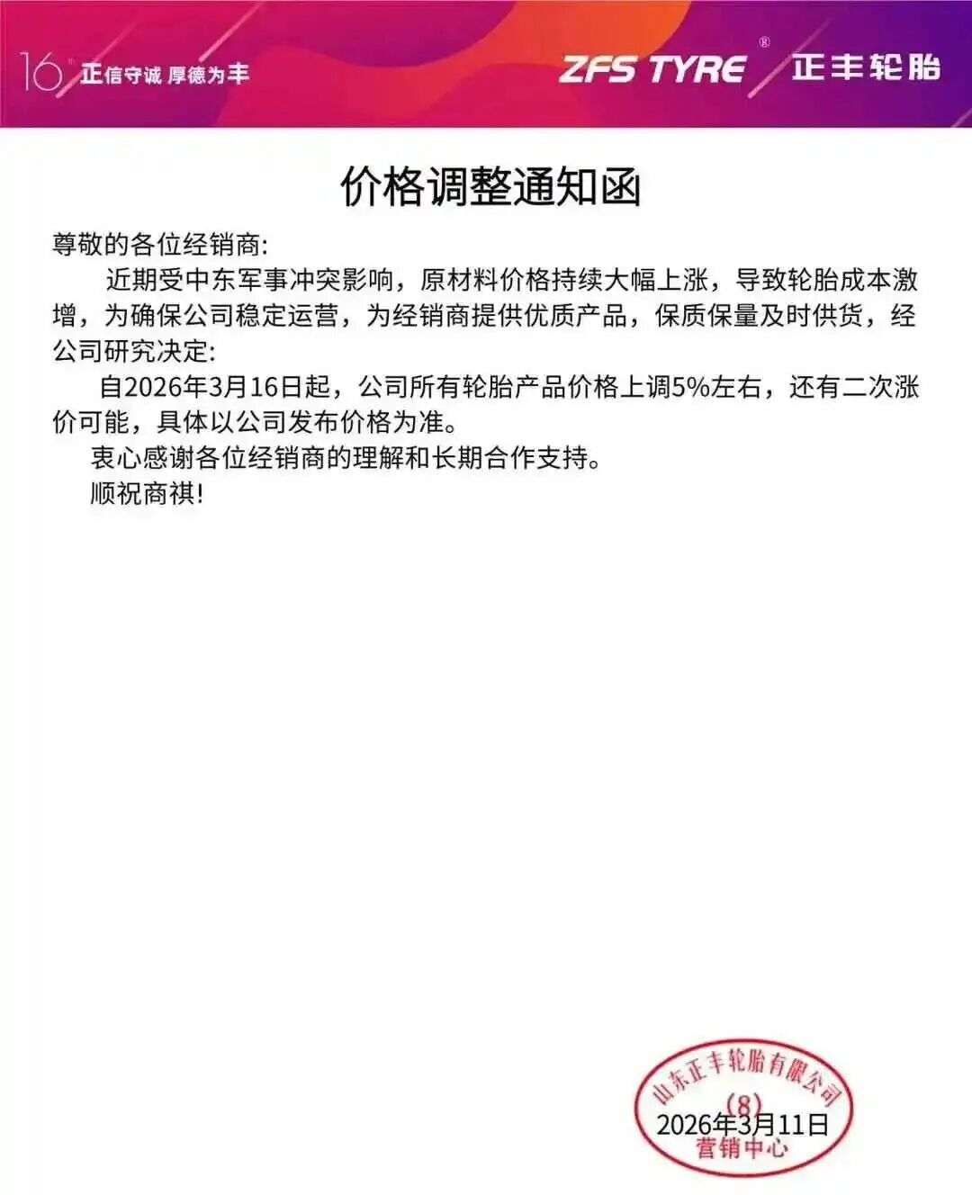 此次涨价潮来势汹汹,头部企业的动作尤为密集且具有风向标意义。3月13日,万力轮胎、雄鹰轮胎、浦林成山同日发布调价通知;3月15日,物产中大旗下欧泰、恒荣橡胶、新桂轮紧随其后,宣布涨价幅度在2%-4%之间。