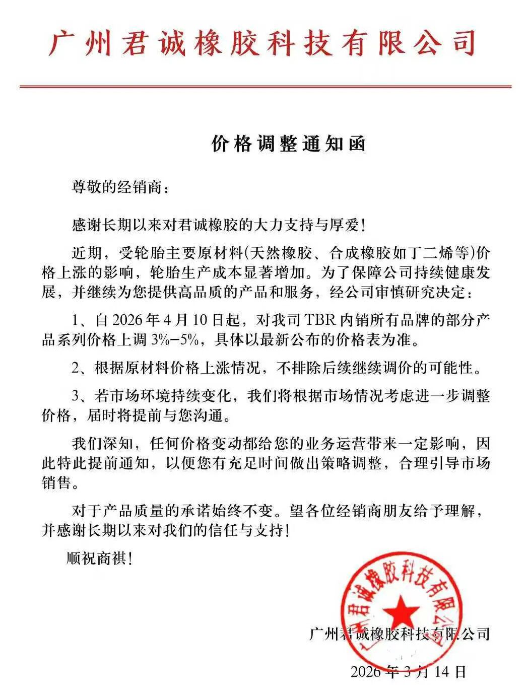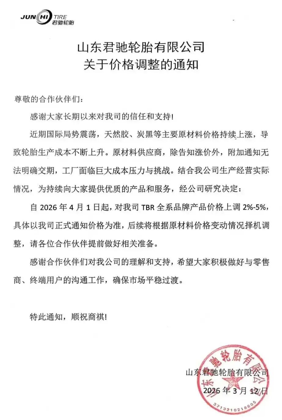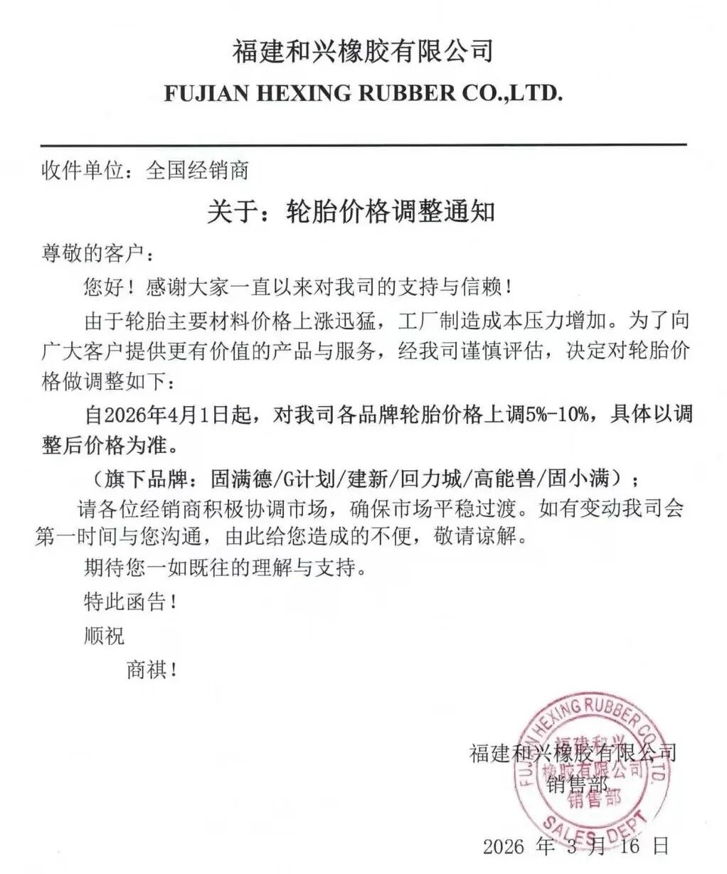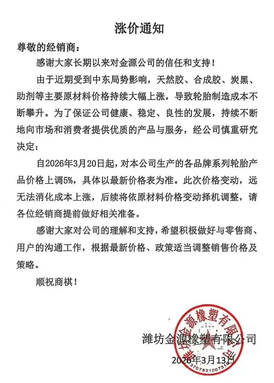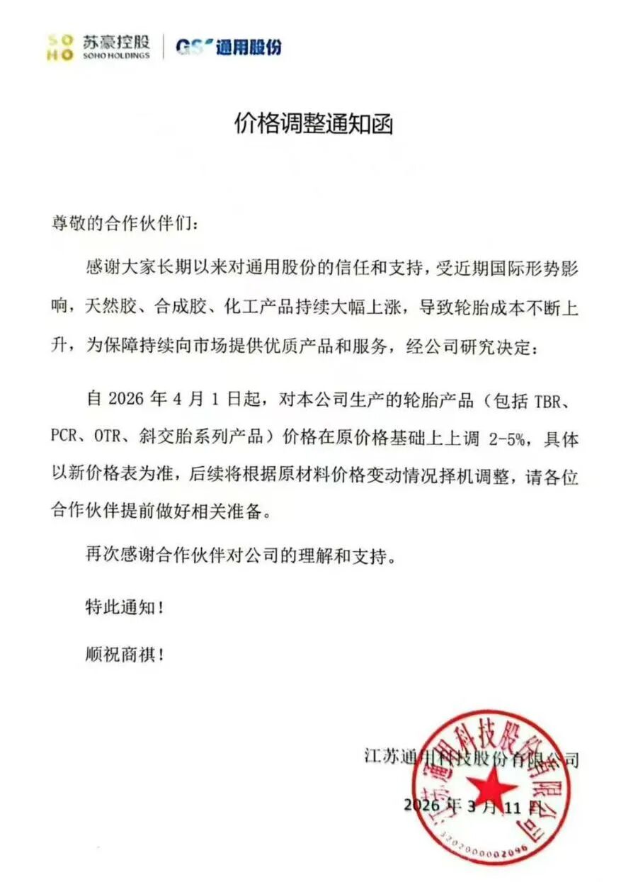 此次涨价潮来势汹汹,头部企业的动作尤为密集且具有风向标意义。3月13日,万力轮胎、雄鹰轮胎、浦林成山同日发布调价通知;3月15日,物产中大旗下欧泰、恒荣橡胶、新桂轮紧随其后,宣布涨价幅度在2%-4%之间。