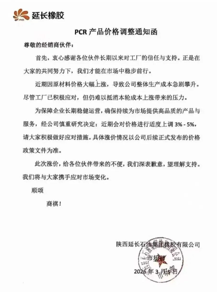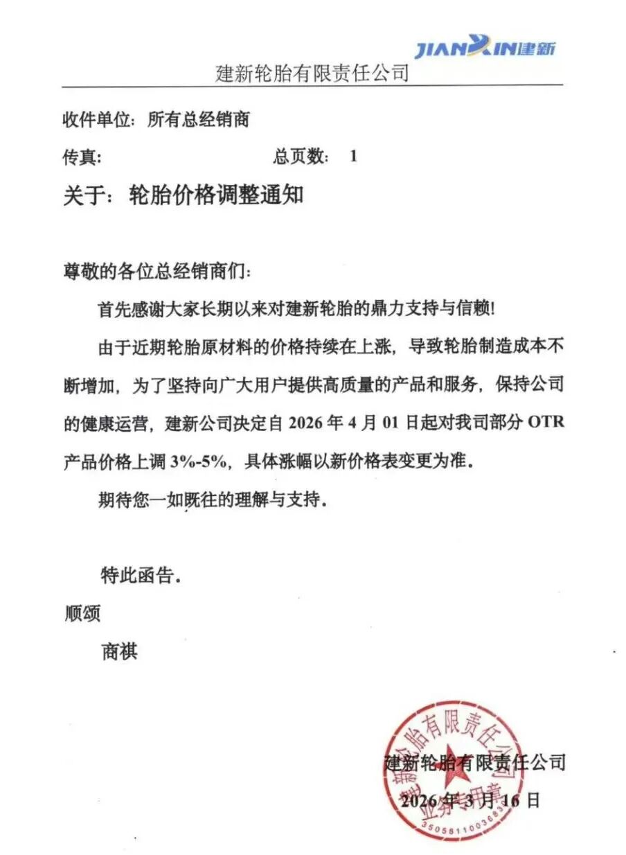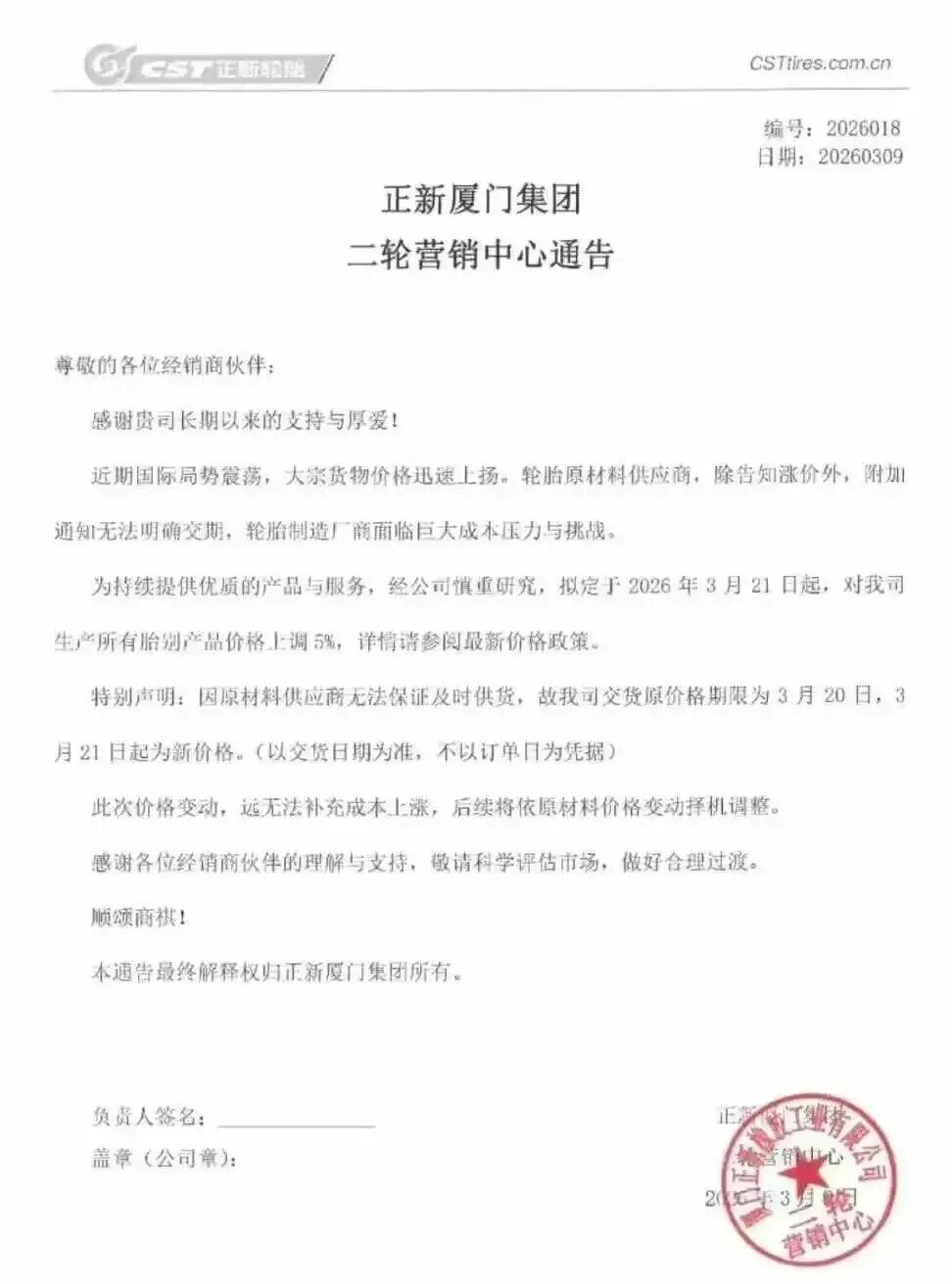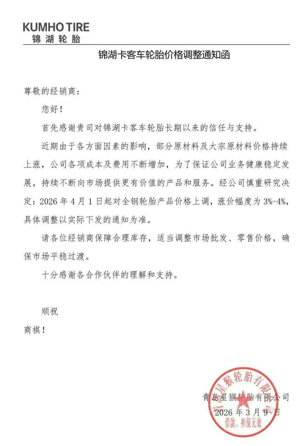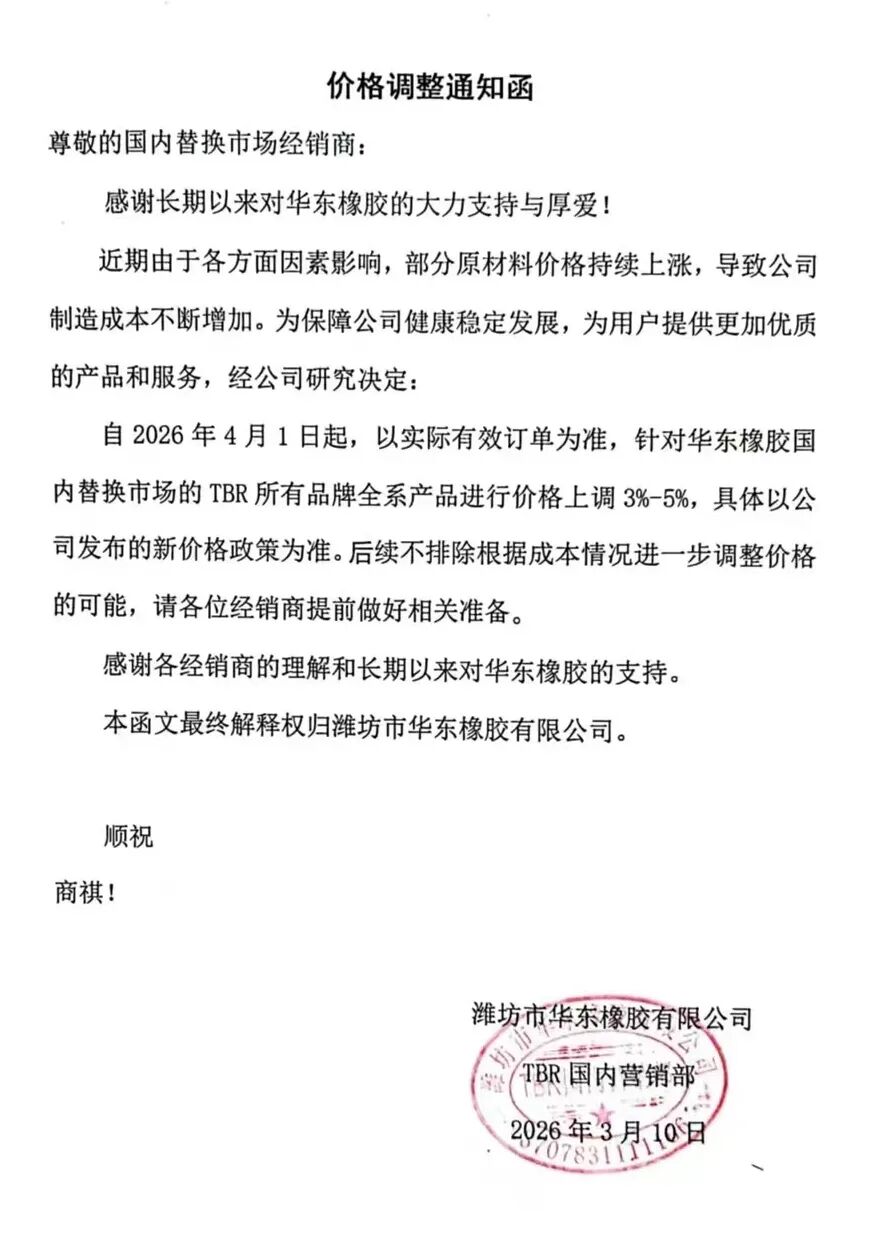 此次涨价潮来势汹汹,头部企业的动作尤为密集且具有风向标意义。3月13日,万力轮胎、雄鹰轮胎、浦林成山同日发布调价通知;3月15日,物产中大旗下欧泰、恒荣橡胶、新桂轮紧随其后,宣布涨价幅度在2%-4%之间。