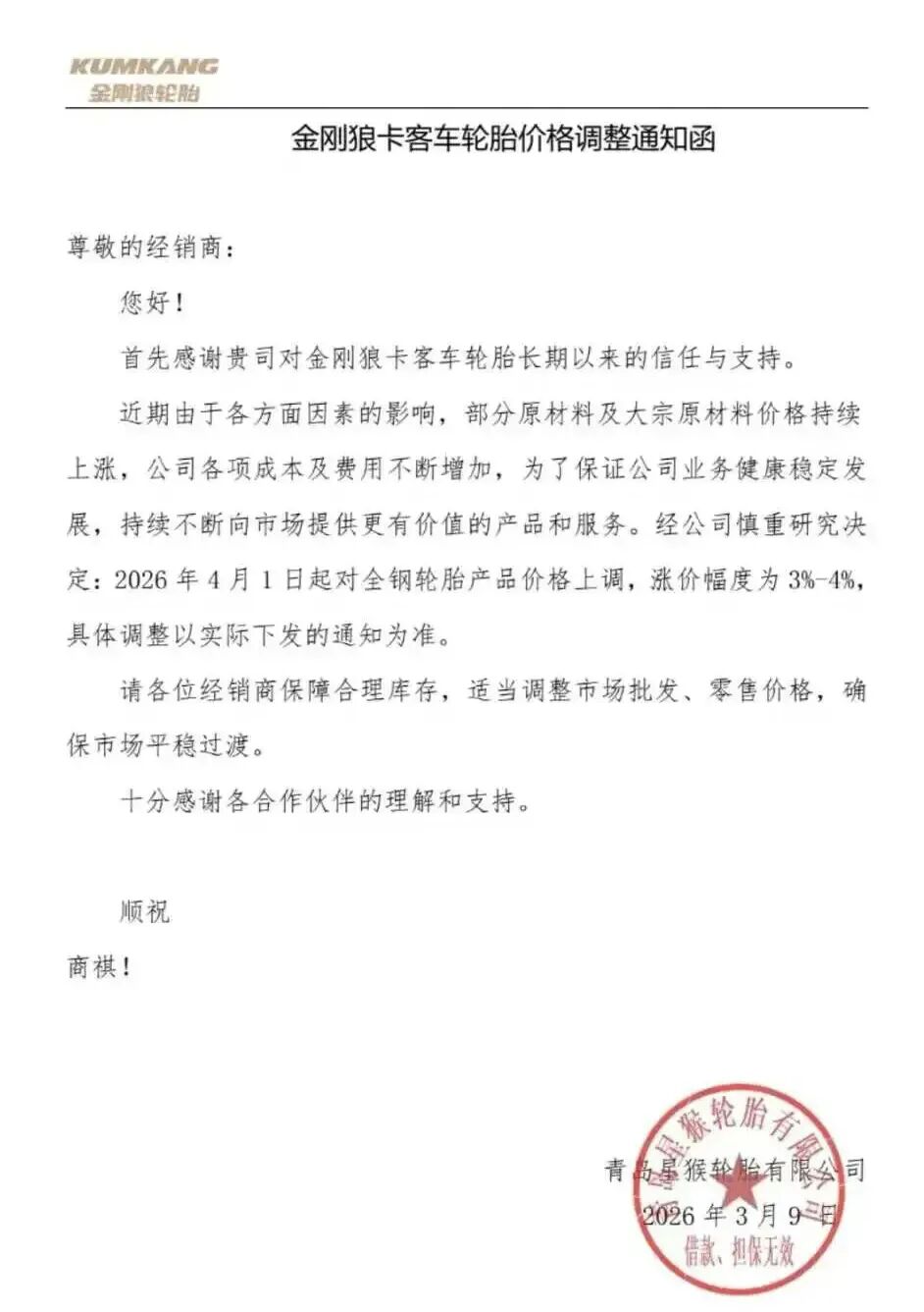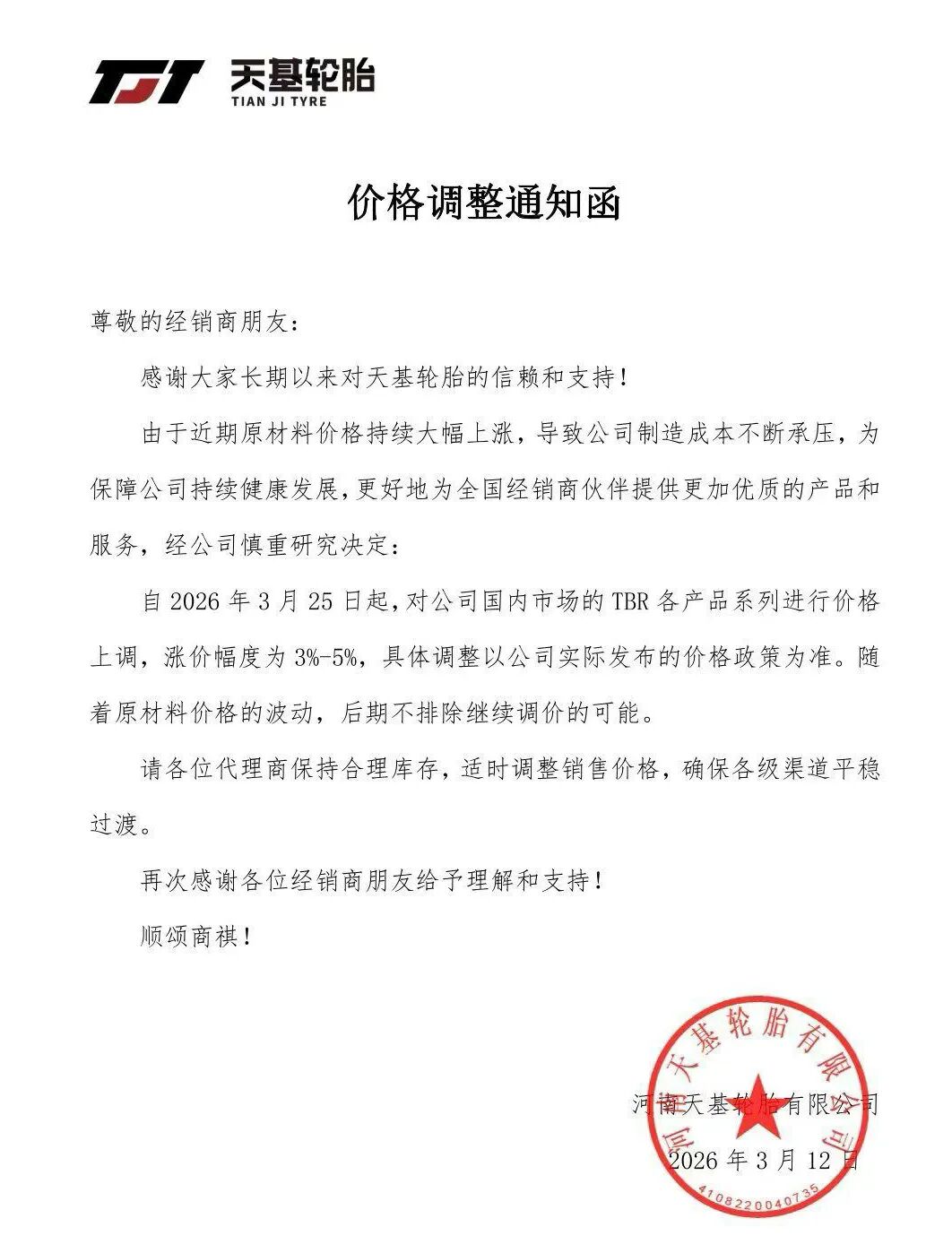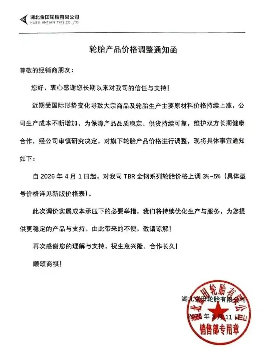 从已发布的74份调价函来看,此轮涨价的幅度普遍集中在2%至5%之间。例如,双钱集团自3月20日起全系产品上调2%;江苏三元轮胎对有内胎TBR产品普涨2%,无内胎TBR产品普涨3%;吉路尔更是宣布自4月1日起全系列产品调整5%,并提示做好再次涨价准备。