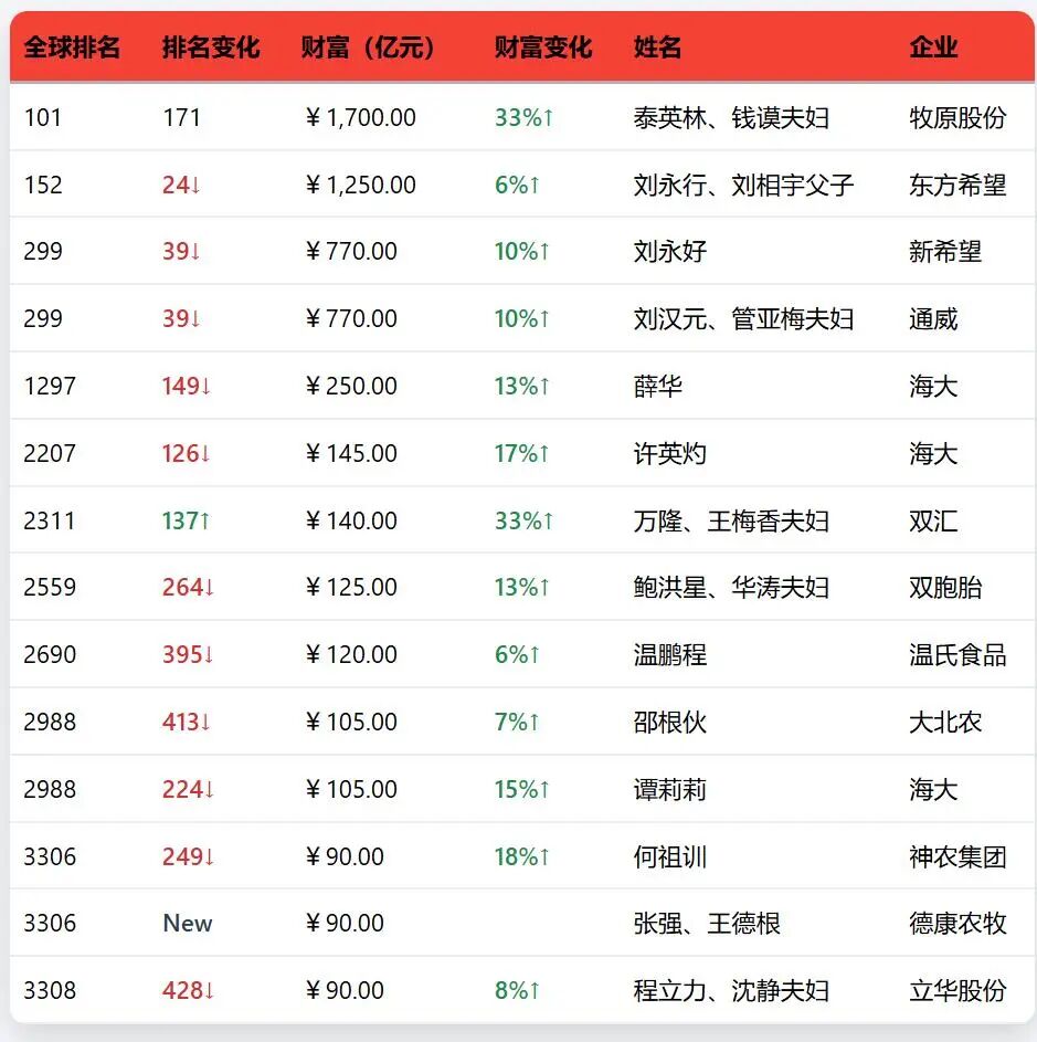 紧随其后的是东方希望的刘永行、刘相宇父子,财富约1250亿元;新希望的刘永好家族和通威的刘汉元、管亚梅夫妇,则分别以770亿元的财富并列第299位 。这几家都是咱们行业里的“老牌劲旅”,在饲料、养殖乃至光伏新能源上都有深厚的布局。