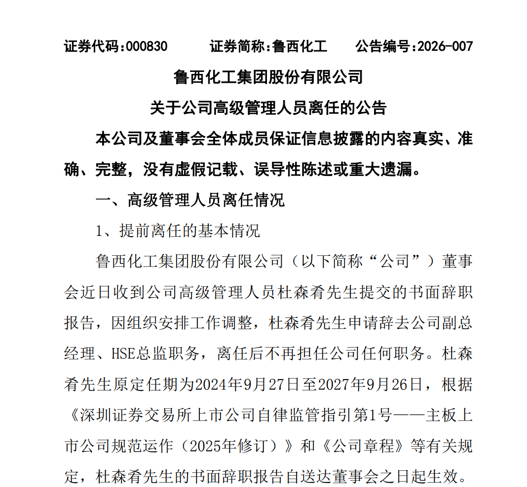 化工行业的高管变动,外界往往盯着股价看。鲁西化工这次调整,目前看属于内部正常轮替。杜森肴离任的原因写的是“组织安排工作调整”,去向没有披露。段绍书则是在原有副总经理职务基础上,多兼一职。