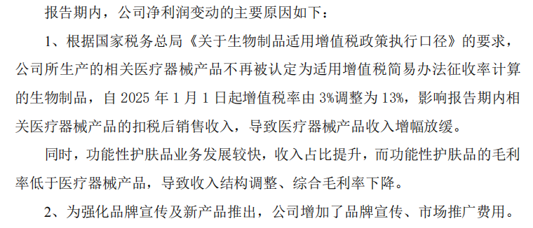 公司业绩大幅下降,主要原因,一是增值税率由3%调整为13%,影响了扣税后销售收入,二是企业的宣传费用以及市场推广费大幅增加,三是研发投入较大。
