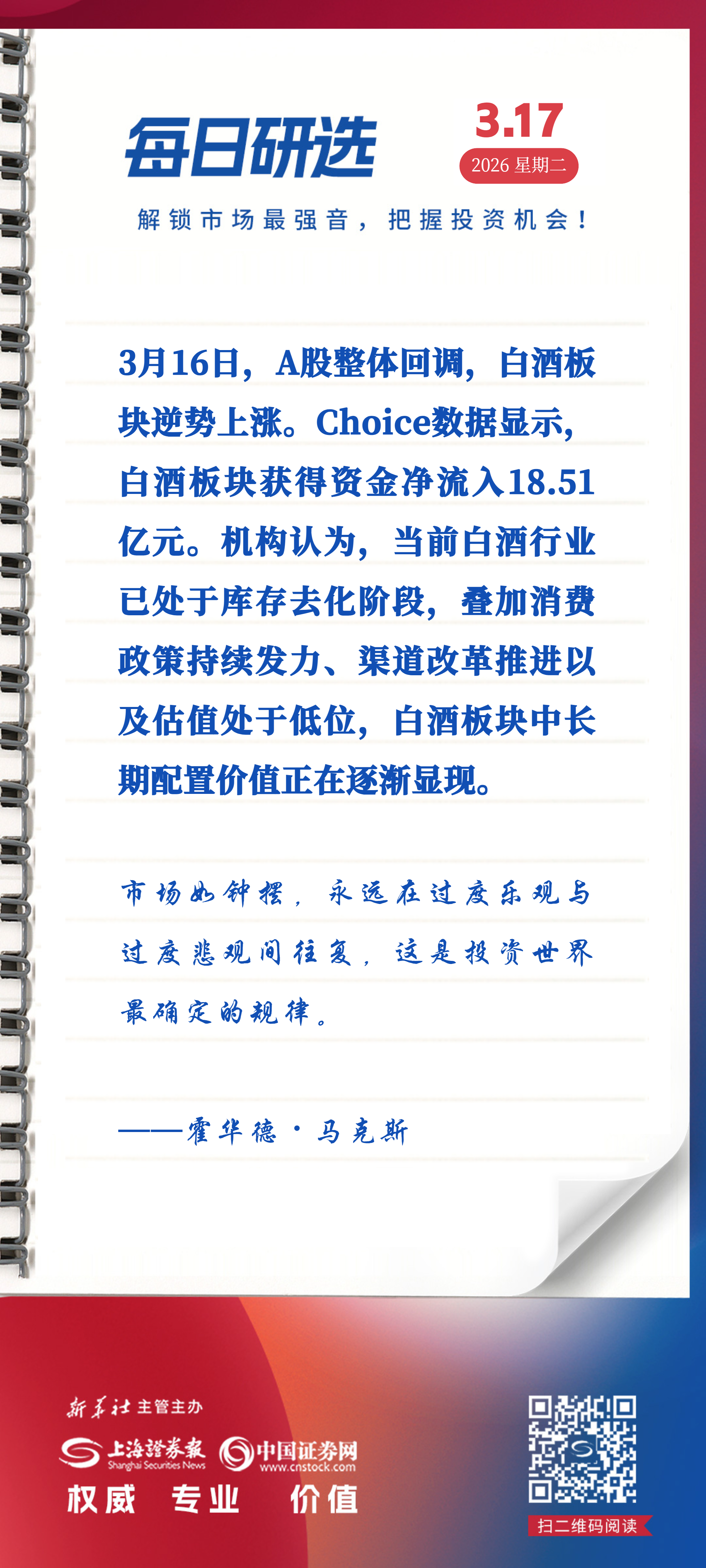 3月16日,A股整体回调,白酒板块逆势上涨。Choice数据显示,白酒板块获得资金净流入18.51亿元。机构认为,当前白酒行业已处于库存去化阶段,叠加消费政策持续发力、渠道改革推进以及估值处于低位,白酒板块中长期配置价值正在逐渐显现。