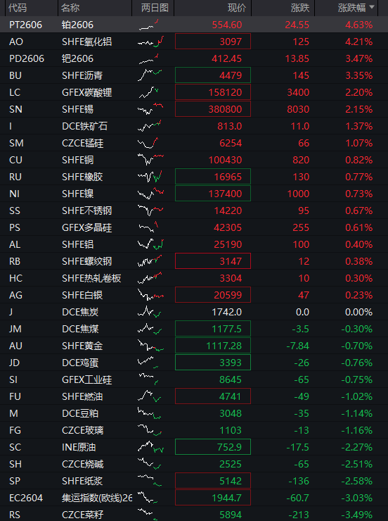 债市方面,国债期货震荡上涨。商品方面,国内商品期货多数走高,铂金、钯金等金属期货涨幅居前,集运指数、原油等商品期货下跌。核心市场走势: