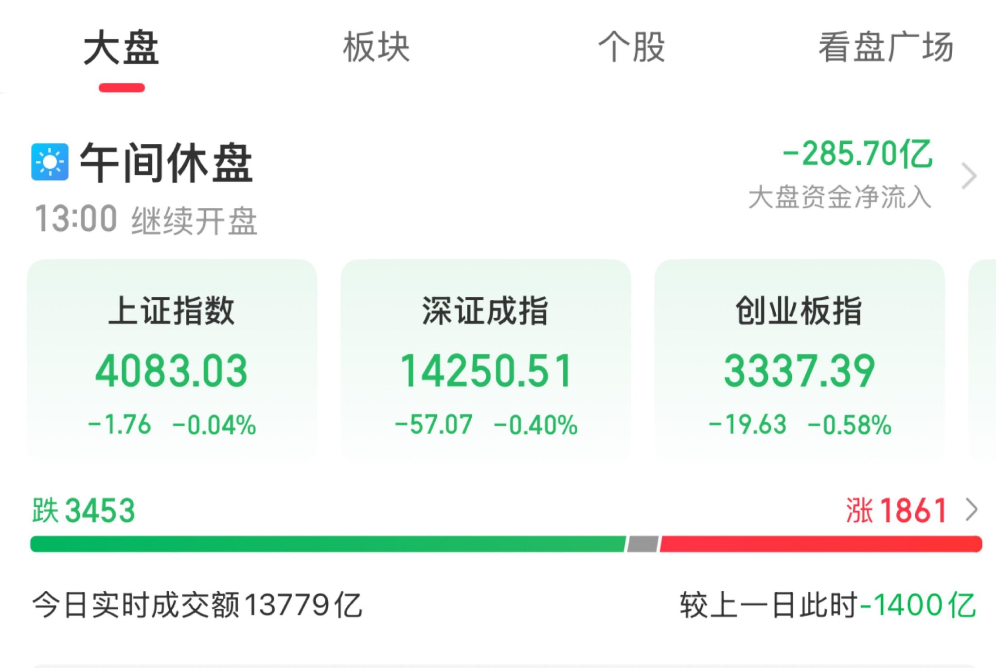 A股三大指数早盘集体下挫,截至午盘,沪指跌0.04%,深成指跌0.4%,创业板指跌0.58%,北证50指数跌0.23%,沪深京三市半日成交额13779亿元,较上日缩量1400亿元。全市场超3400只个股下跌。
