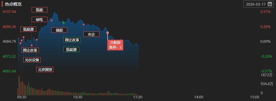 盘面上,在隔夜英伟达GTC大会举行后,CPO、光纤、铜箔等AI硬件股早盘多数下跌,炬光科技、中富电路(300814)、天孚通信(300394)跌幅居前。油气股跟随隔夜国际油价下跌,通源石油(300164)、洲际油气(600759)、石化油服(600871)等股下挫。另一方面,房地产板块延续近日涨势,京投发展(600683)录得3连板,此前上海商业用房购房贷款最低首付款比例调整为不低于30%。证券、保险等非银金融板块盘中异动,国信证券、广发证券,此前蚂蚁集团收购耀才证券的要约已获批准,市场情绪或受积极影响。此外,钢铁、汽车整车、光伏设备等板块均有一定表现。