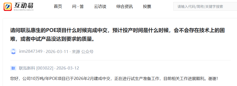 2026年3月12日,联泓新科在互动平台回答投资者提问时表示,公司10万吨/年POE项目于2026年2月建成中交,已进入试生产准备阶段。