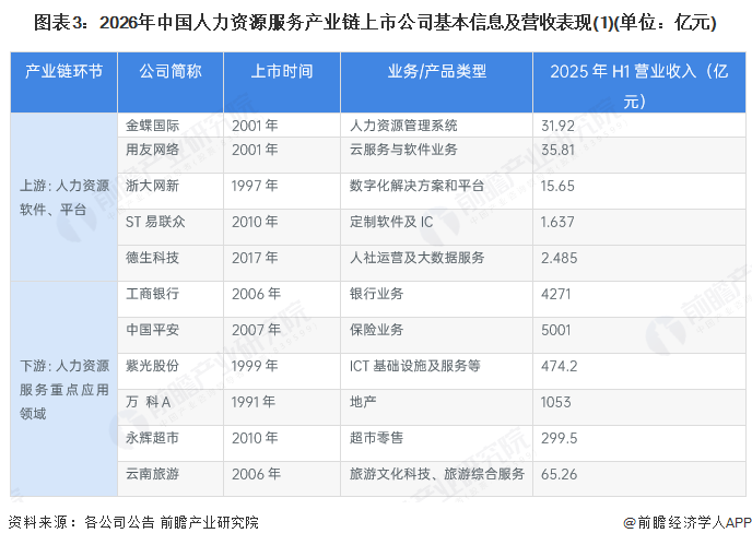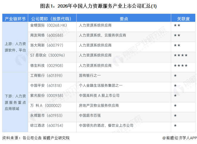 中国人力资源服务行业产业链上下游的主要上市公司汇总如下: