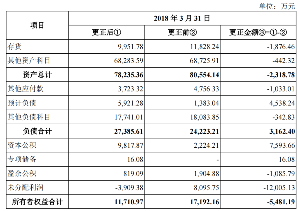 据披露,调整金额较大的是资本公积、预计负债、未分配利润、存货的数据,各调整7593.66万元、4538.24万元、-1.2亿元及-1876.46万元。