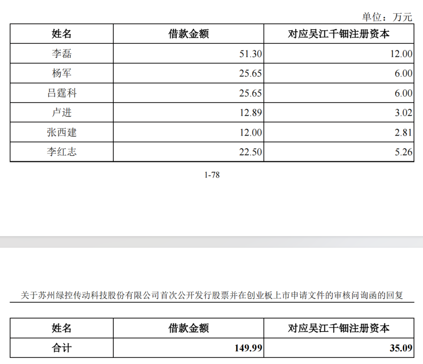 2013年12月,绿控传动曾借款给李磊、杨军、吕霆科、卢进、张西建和李红志,用于股权激励出资,借款金额合计149.99万元,均已偿还。
