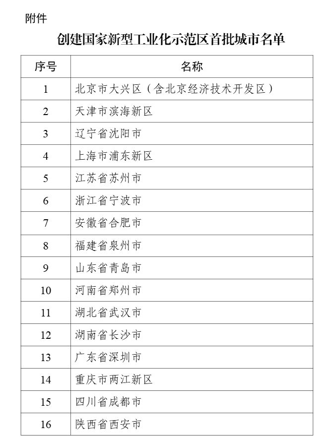 工信部公布创建国家新型工业化示范区首批城市名单