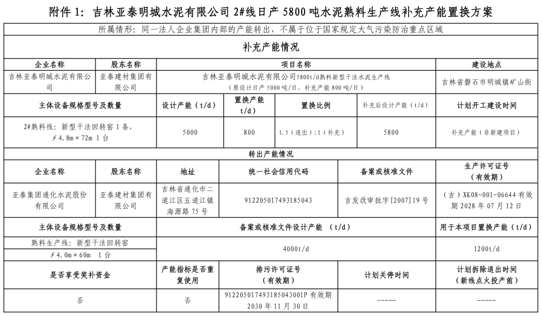 亚泰集团通化水泥退出一条4000t/d熟料生产线,其中12000t/d产能用于补充吉林亚泰明城水泥一条5000t/d熟料线,补齐后产能5800t/d,置换比例1.5:1。