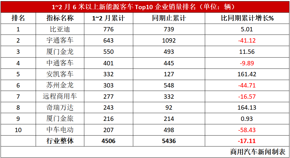 整体来看,1、2月作为一年开局的两个月,也是最受上年底销量冲刺和春节假期影响的两个月。 今年前2月,6米以上新能源客车行业累计销量同比下降17.11%,固然有去年同期基数较高的因素,但也反映出市场需求尚未完全释放。进入3月,随着各地公交招标陆续启动、“以旧换新”政策逐步落地,新能源公交车的渗透率将继续提升,市场需求也将进一步释放。接下来,6米以上新能源客车市场销量是否也能回归增长通道?商用汽车新闻传媒将继续关注!