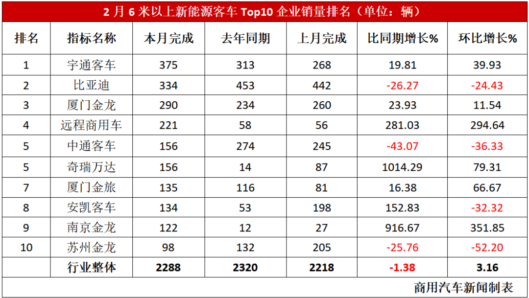 同时在2月,共有宇通客车、厦门金龙、远程商用车、奇瑞万达、厦门金旅、南京金龙6家企业实现了同环比双增长。
