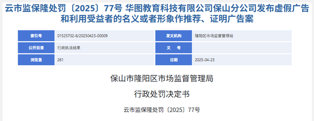 此事发生在去年4月下旬。据云南保山市隆阳区市场监督管理局在那时下发的行政处罚决定书“云市监保隆处罚〔2025〕77号”显示,该局与保山市市场监督管理局联合开展公务员考试培训机构检查,在华图教育科技有限公司保山分公司经营场所发现其有包含“面试0元学”字样的地贴广告,以及利用学员信息制作的“过关光荣榜”墙面广告。