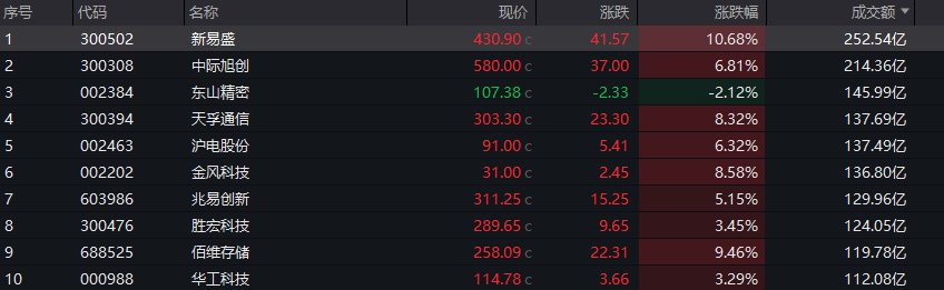 个股方面,新易盛全天成交额超252亿元,位居沪深两市第一;中际旭创、东山精密、天孚通信等个股成交额居前。