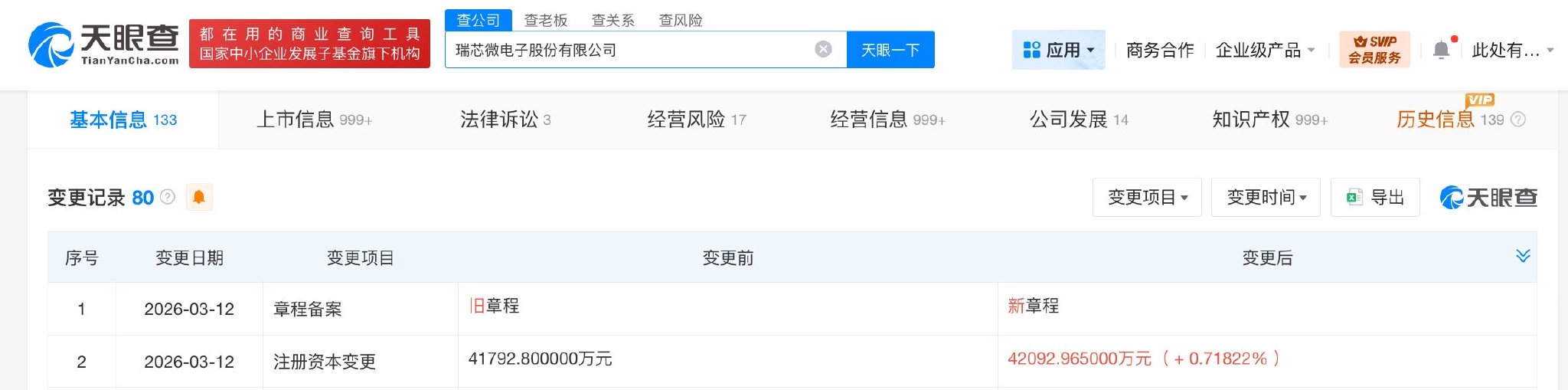 每经AI快讯,天眼查工商信息显示,近日瑞芯微(603893)发生工商变更,注册资本由约4.18亿元人民币增至约4.21亿元人民币。瑞芯微电子股份有限公司成立于2001年11月,法定代表人为励民,经营范围含集成电路设计、集成电路销售、集成电路芯片设计及服务、集成电路芯片及产品销售等。股东信息显示,该公司由励民、黄旭等共同持股。