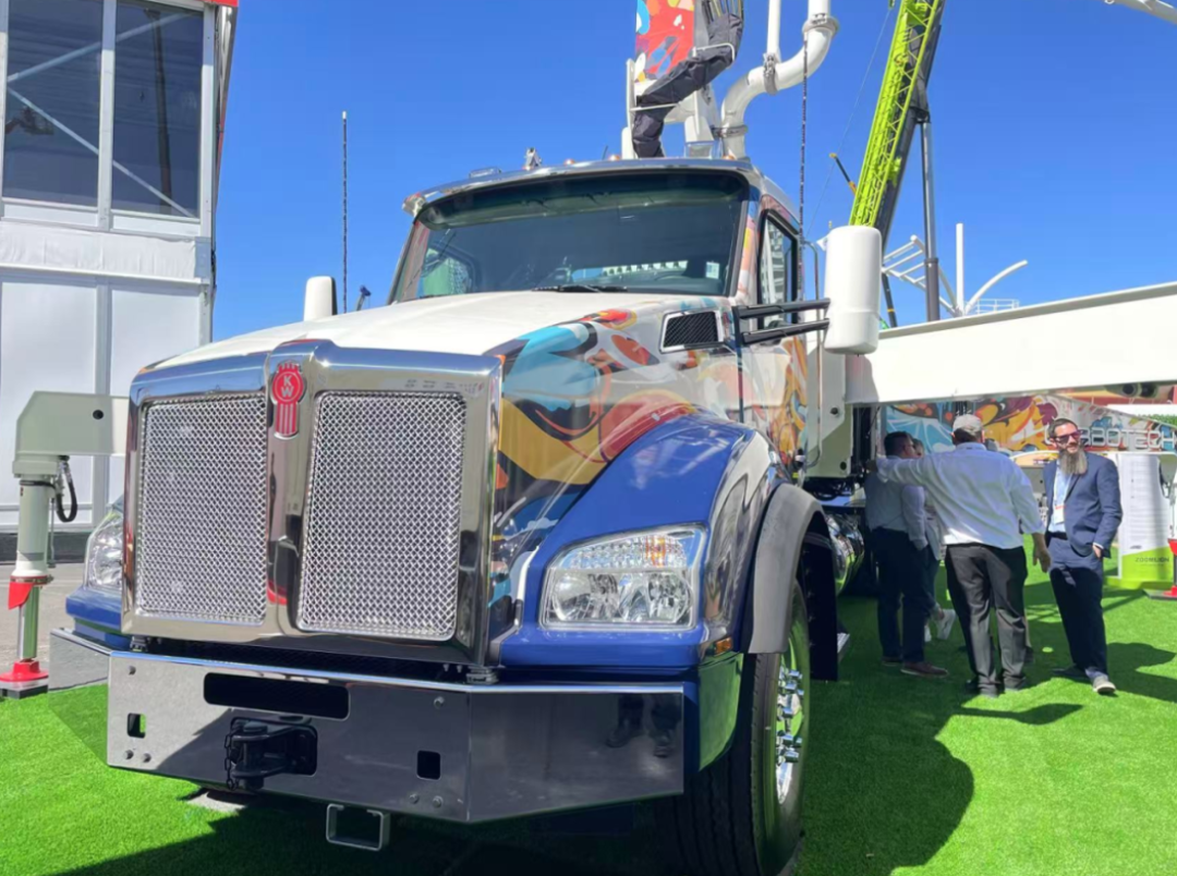 采用“美漫”涂装、搭载北美专用底盘的混凝土泵车,最大垂直臂展达151英尺,最大理论排量180立方米/小时,臂架最后两节采用碳纤维技术,实现25%减重并增加有效载荷,持续展现出中联重科在高端混凝土设备领域的技术实力。