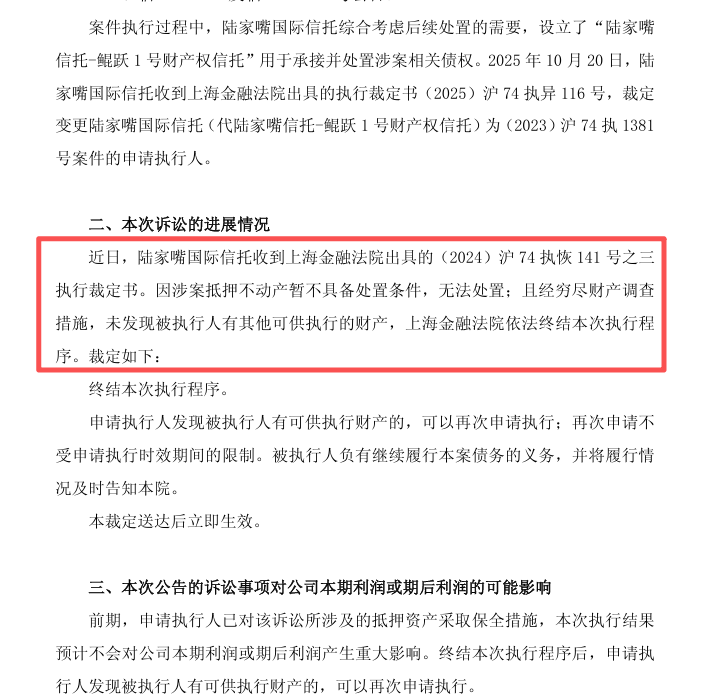 2026年3月19日,上海陆家嘴金融贸易区开发股份有限公司(A 股:600663,B股:900932,陆家B股)发布临 2026-007 号公告,披露控股子公司陆家嘴国际信托有限公司涉及的债券交易债务纠纷诉讼最新执行进展,该案因涉案抵押不动产暂不具备处置条件,且经穷尽财产调查措施、未发现被执行人其他可供执行财产,被上海金融法院依法终结本次执行程序。