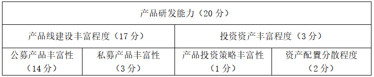 产品研发能力主要考察产品线建设丰富程度和投资资产丰富程度两方面。产品线建设丰富程度将针对公募、私募产品分别考察,以更加合理地反映不同类型客户群体对产品研发的需求差异。投资资产丰富程度一方面考察机构所发行理财产品的投资策略丰富性,另一方面考察机构的大类资产和前十持仓资产配置分散度。