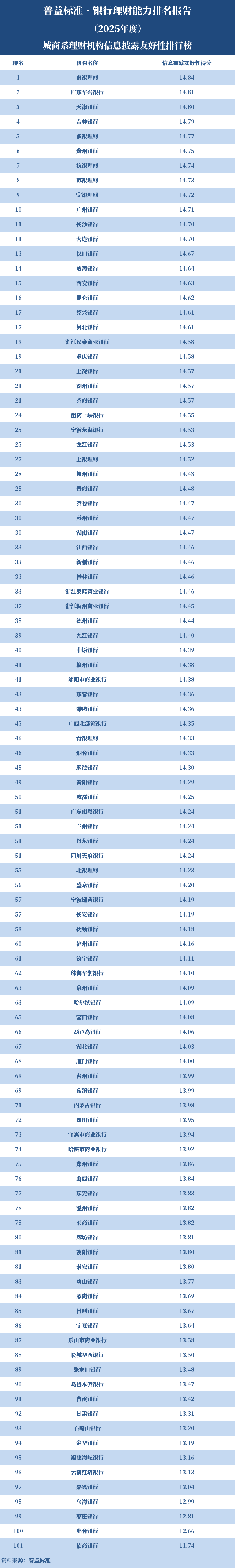 2025年度,城商系理财机构中,信息披露友好性排名前十的依次是南银理财、广东华兴银行、天津银行、吉林银行、徽银理财、贵州银行、杭银理财、苏银理财、宁银理财、广州银行。