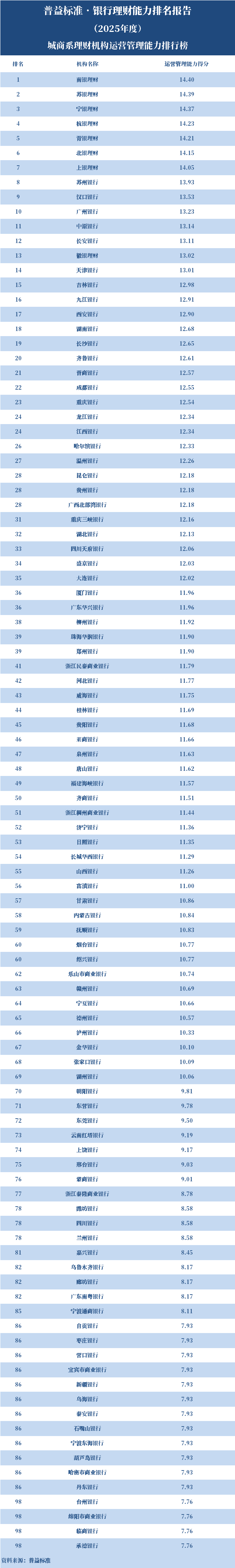 2025年度,城商系理财机构中,运营管理能力排名前十的依次是南银理财、苏银理财、宁银理财、杭银理财、青银理财、北银理财、上银理财、苏州银行、汉口银行、广州银行。