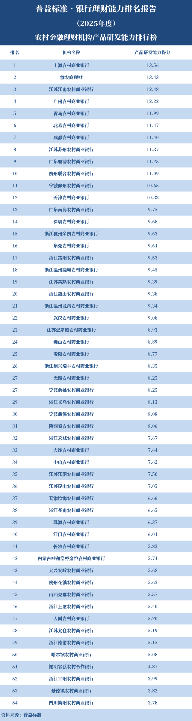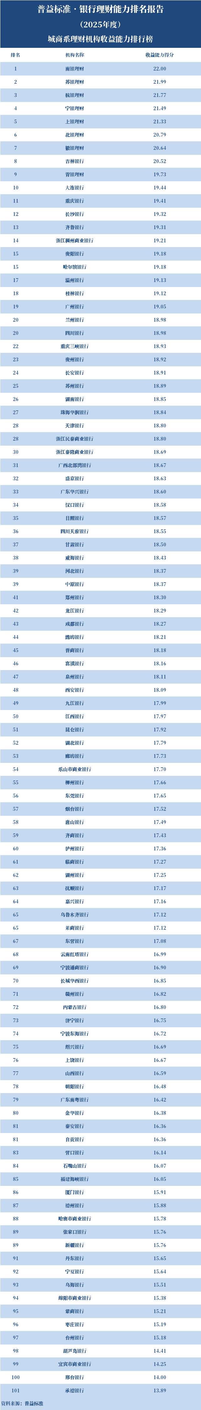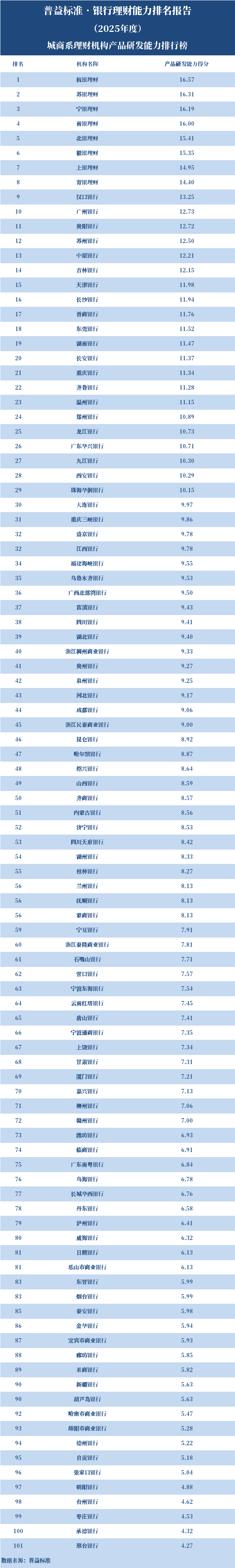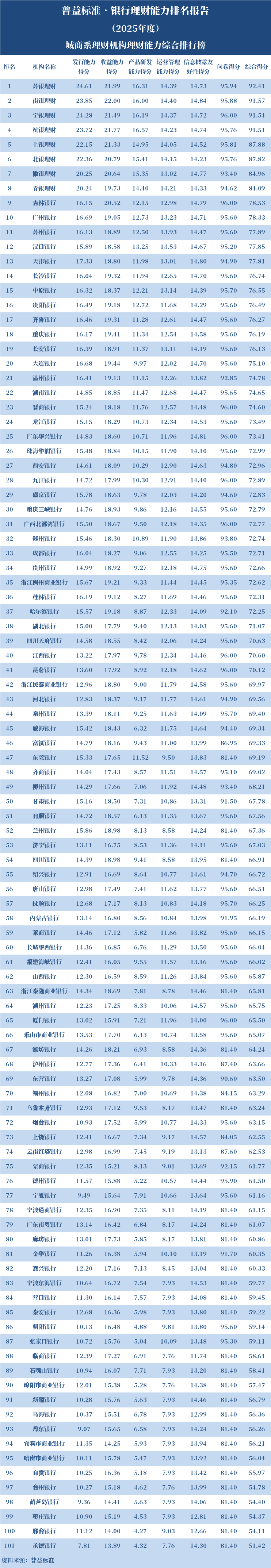 2025年度,城商系理财机构中,产品研发能力排名前十的依次是杭银理财、苏银理财、宁银理财、南银理财、北银理财、徽银理财、上银理财、青银理财、汉口银行、广州银行。