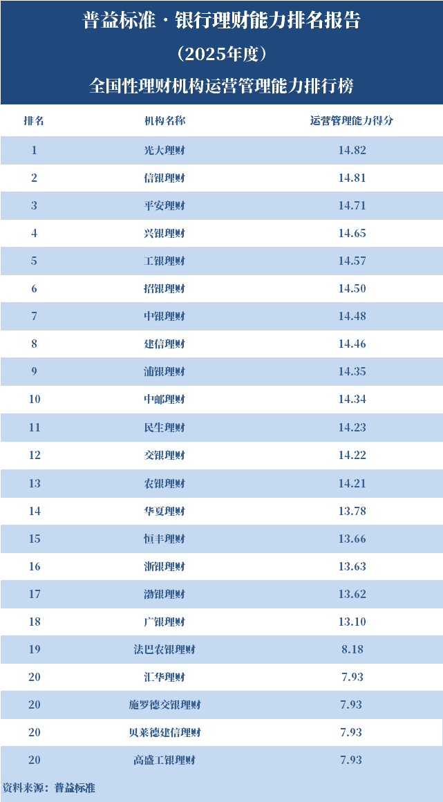 2025年度,全国性理财机构中,运营管理能力排名前五的依次是光大理财、信银理财、平安理财、兴银理财、工银理财。