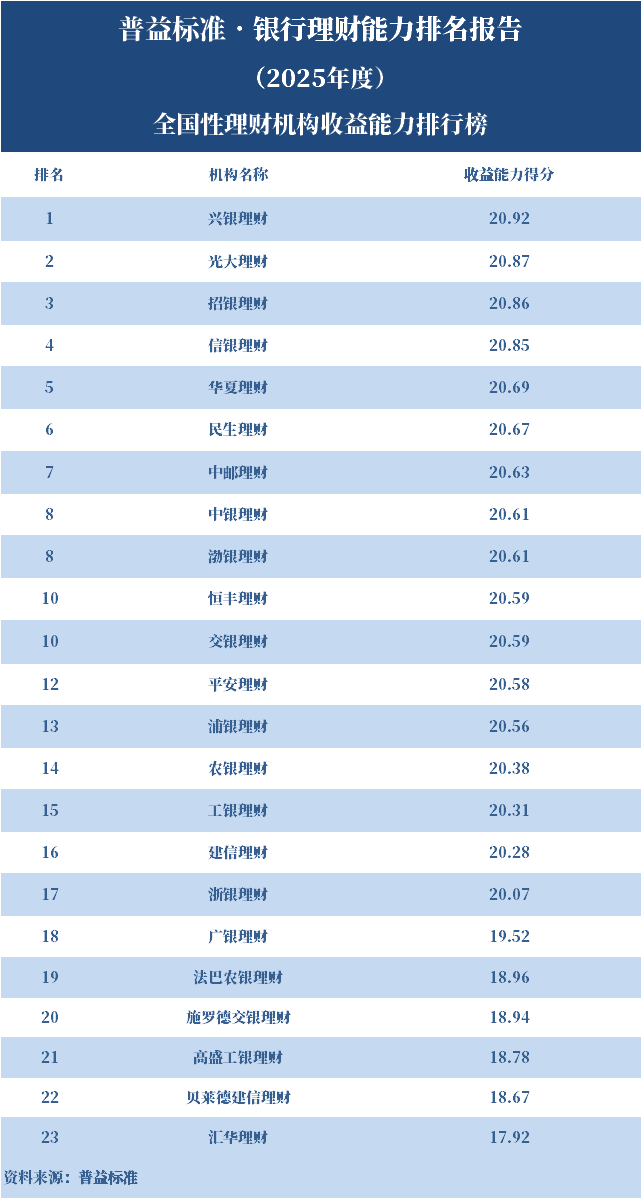 2025年,全国性理财机构中,理财能力综合排名前五的依次是兴银理财、信银理财、招银理财、光大理财、中银理财。