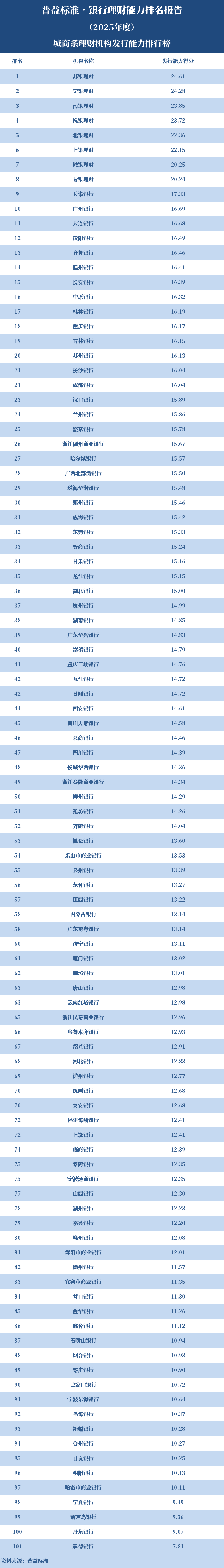 在城商系理财机构中,2025年度银行理财产品发行能力排名前十的依次是苏银理财、宁银理财、南银理财、杭银理财、北银理财、上银理财、徽银理财、青银理财、天津银行、广州银行。