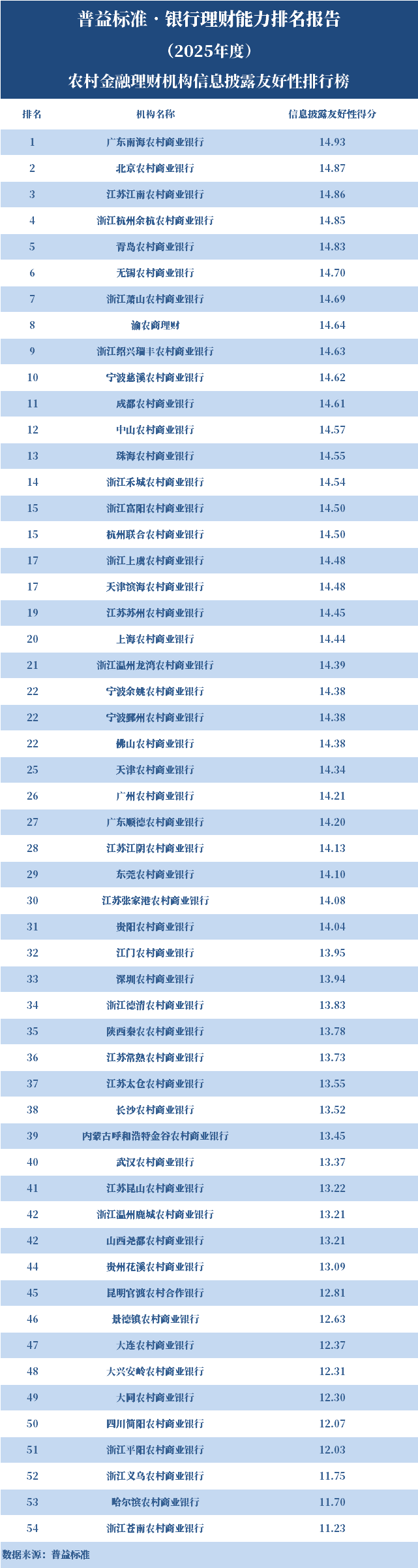2025年度,农村金融理财机构中,信息披露友好性排名前十的依次为广东南海农商银行、北京农商银行、江苏江南农商银行、浙江杭州余杭农商银行、青岛农商银行、无锡农商银行、浙江萧山农商银行、渝农商理财、浙江绍兴瑞丰农商银行、宁波慈溪农商银行。