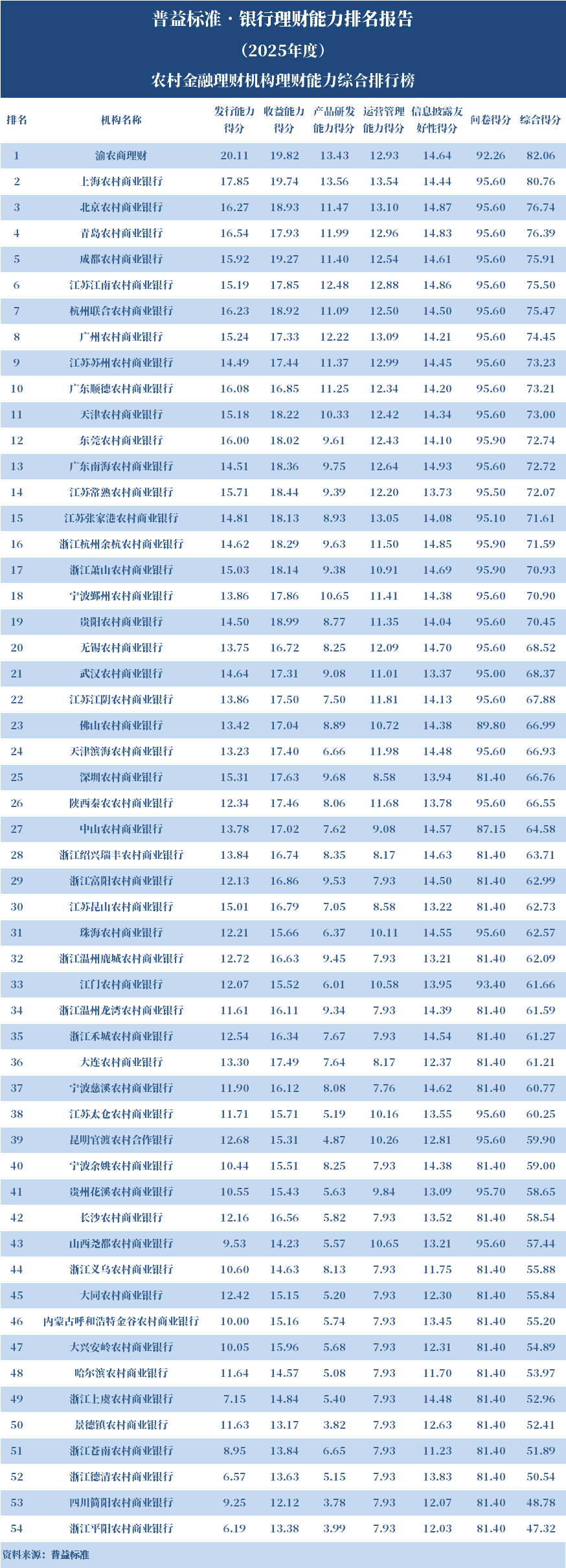 从数据统计来看,2025年参与排名的农村金融理财机构为54家,较2024年减少77家。渝农商理财发行能力、收益能力得分均位居农村金融理财机构首位,产品研发能力得分位居第二,其他各项也名列前茅,故其理财能力综合得分居于农村金融理财机构首位;上海农商银行产品研发能力和运营管理能力得分均位居农村金融理财机构首位,发行能力和收益能力得分位列第二,故其理财能力综合得分居于农村金融理财机构第二位;北京农商银行运营管理能力和信息披露友好性得分均位列农村金融理财机构第二,发行能力得分位列第四,收益能力得分位列第五,故其理财能力综合得分名列农村金融理财机构第三。