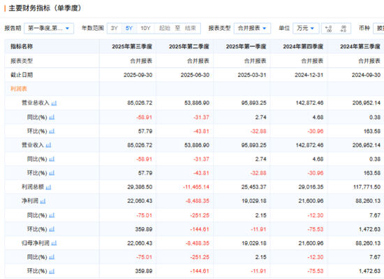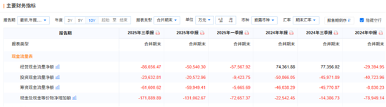 现金流的持续恶化是最直接的体现。根据公司现金流量表数据,2025年前三季度,公司经营活动现金流净额为-8.67亿元,同比由正转负,暴跌212.02%;投资活动现金流净额为-2.36亿元,筹资活动现金流净额为-6.16亿元,现金流净流出意味着公司资金持续消耗。